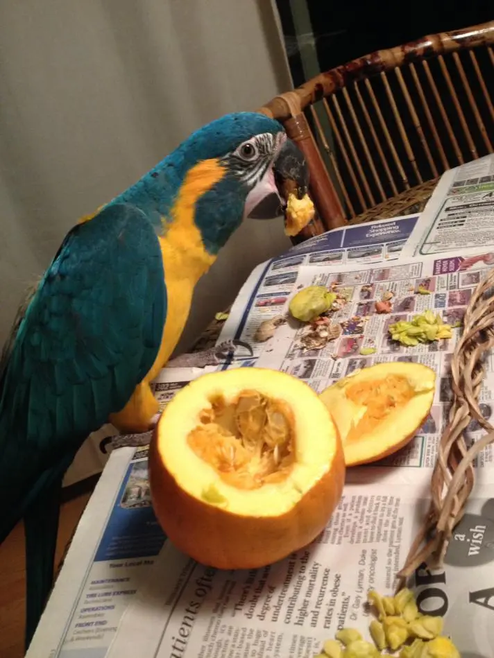 He is a pretty well trained boy. He does not wander on the floor. He gets along with other animals (dogs and cats), and he travels well in his carrier. He is not a picky eater. He loves fruits and veggies (corn, bananas, grapes, peas, beans are his favorites). He also LOVES Harrisons. He’ll almost always eat that before any other dry food offered.