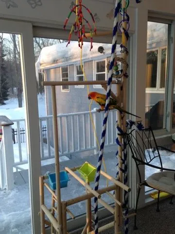 My son and husband built it for Robin. We simplified it for Brax and kept the toys high so they don't poop on them. There is a big base with newspapers so it's easy to clean up. They love to climb the rope. Braxy is pretty shy, spooked very easy so he's not hanging out there much, we have a very big red hawk and the blue herons nest a street over so the porch isn't safe for Brax! He flies when he's spooked Robin spent his entire day on the sun porch on the play ground. It did have a 'bath tub' but we won't put it on until Spring.