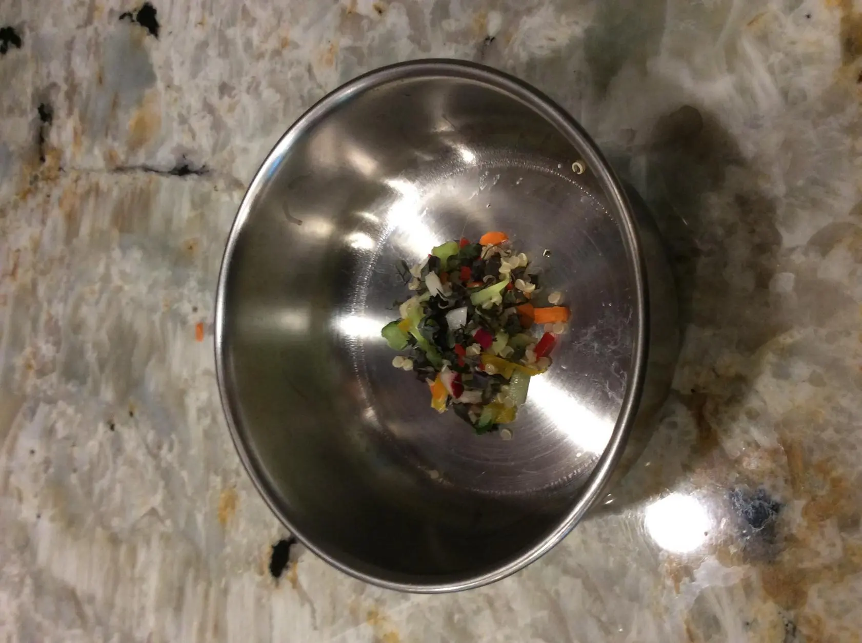 Please share pictures and/or descriptions of the chops you make for your bird(s). Below is an example of one I made today. It's carrots, pumpkin seeds, basil flowers and seed pods, and a Chex cereal square crushed.