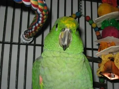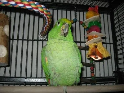 Well I have some great news as of yesterday that I can't wait to share. I had recently been told of a Mealy Amazon that was dropped off at a pet store where I have a friend that works. This gorgeous Amazon was in a cage that was about 20" Long x 12" wide x 20" high. If that wasn't bad enough the cage had about 2 inches of poop covering it. This Amazon has been fed a diet of sunflower seeds and candy. The lady who had owned her dropped her off admited that men have flicked books at this Amazon. Needless to say now she is quite nervous around men. All that this woman has said about the Amazon was that she thought it was a Yellow Naped, it was approximately 29 years old and its name was Pepsi. Well she is actually a Mealy Amazon. She looked like she had never had her nails trimmed, some were cracked off and others were growing right around back into her feet. Her beak was in such a mess.