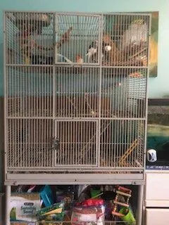 I know it sounds awful, but they don't mind. I got the cage from a garage sale for $15 i couldn't say no. if it was a peice of trash? THROW IT OUT, what is $15? so i got it. I was wondering if there was a way to take the two sections out of the middle so that i can make it a flight cage? if anyone has some ideas, please let me know. I can try to include some more pics if it is needed, but the screws i can't see from the outside, and i know that the cage didn't arrive at their door pre-assembled. it is a 3-story cage, and ignore all the bird stuff under the cage LOL. they are spoiled. so also they only use one section bc i found it too hard to keep up with 3 water bowls, 3 food sources, and my birds would ignore some and use some ect. so ignore the two bottom levels. basically, where there is a line in the cage, it is a grate. also it becomes SUPER difficult to clean the grate in the middle bc they poop on it and i can't reach my hand it there, so it is becoming a health hazard for me and the birds..