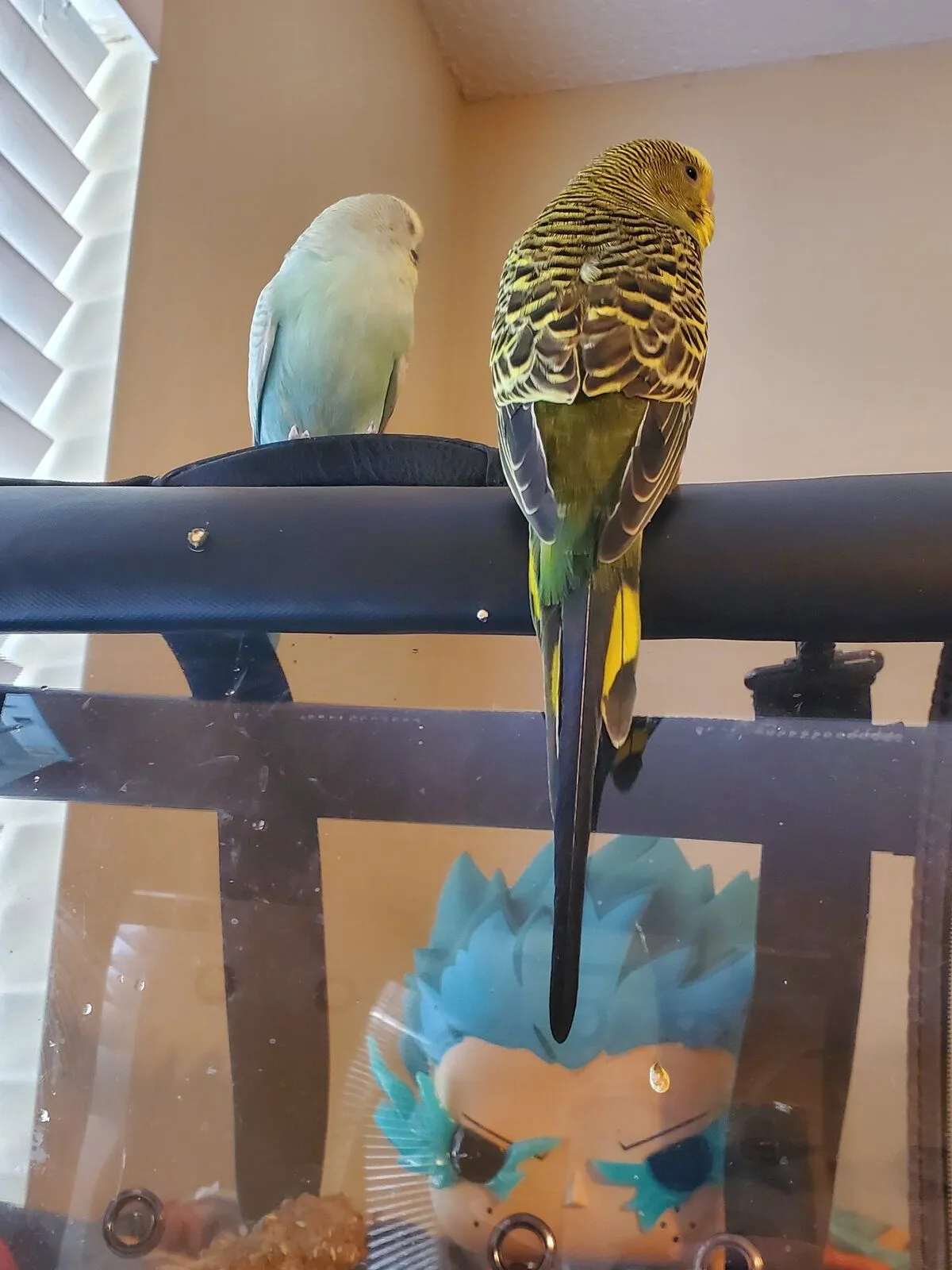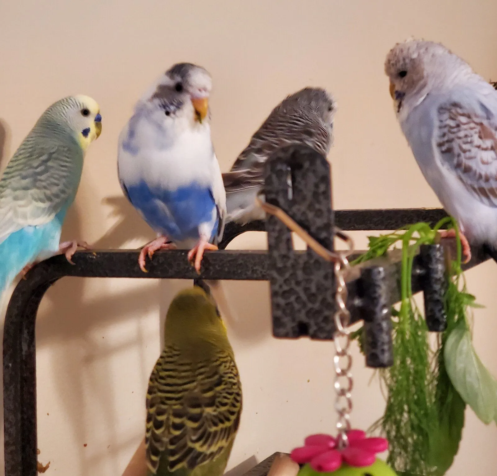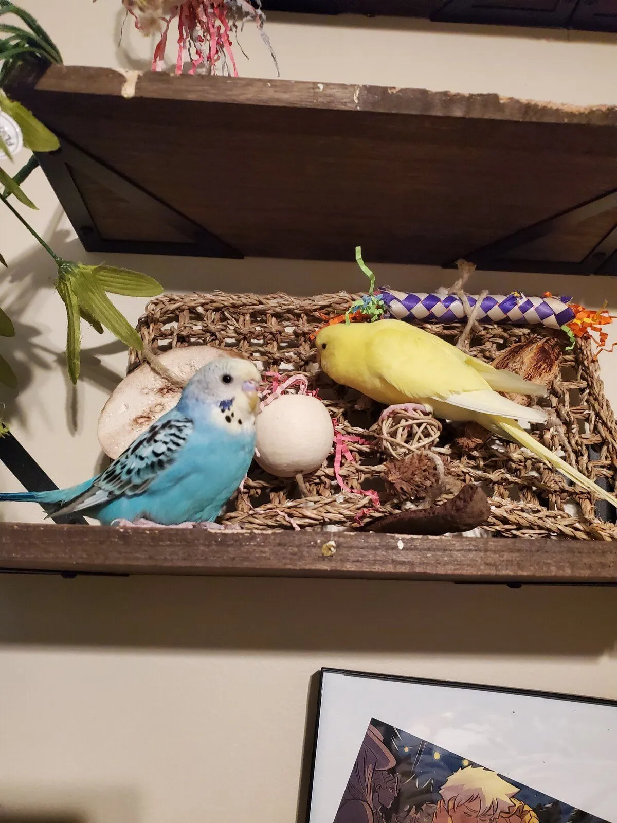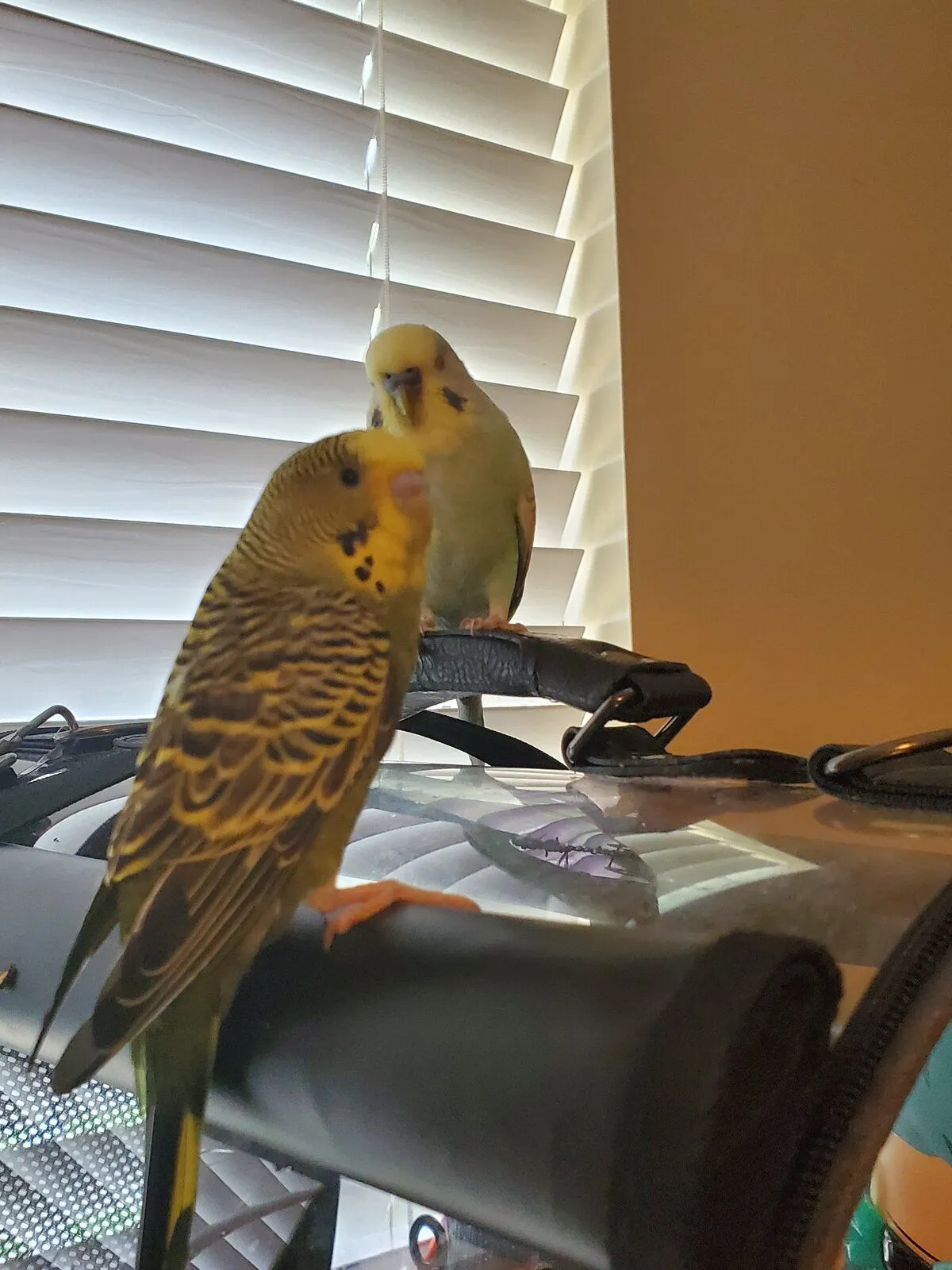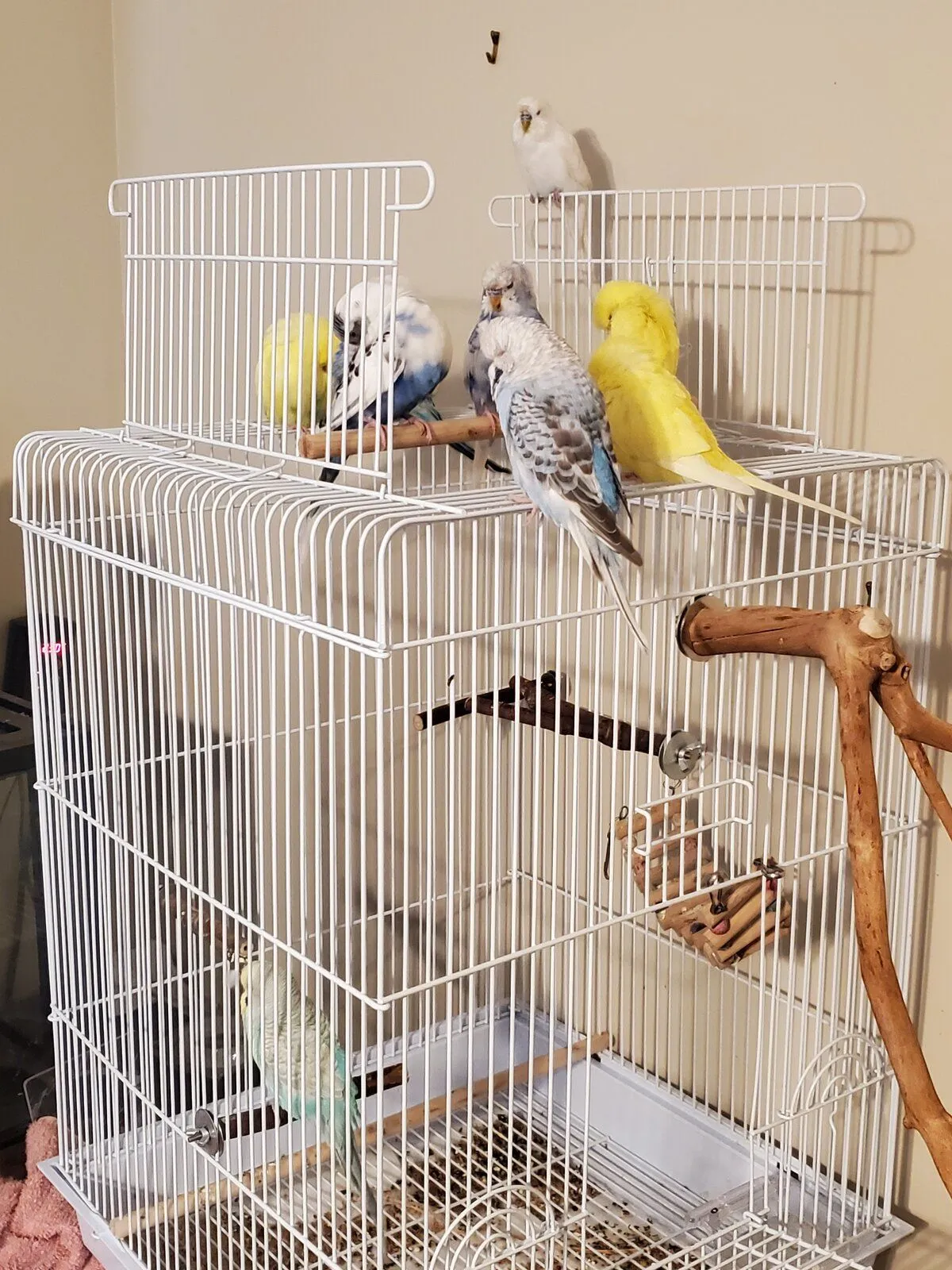 Here is some photos of my budgies playing in my room. I've been setting up a budgie room so they're playing with my stuff. These are not their cages, they're just used for playground purposes! Most of them came with the rehomed budgies.
