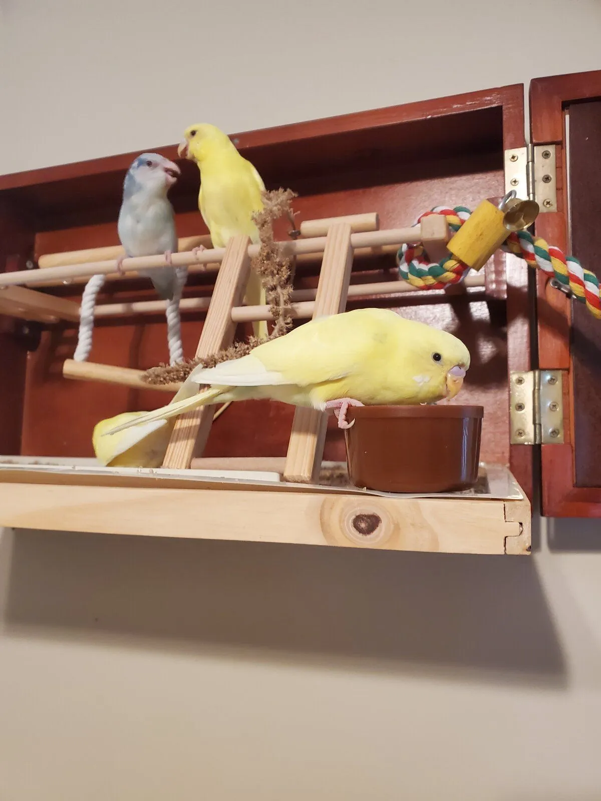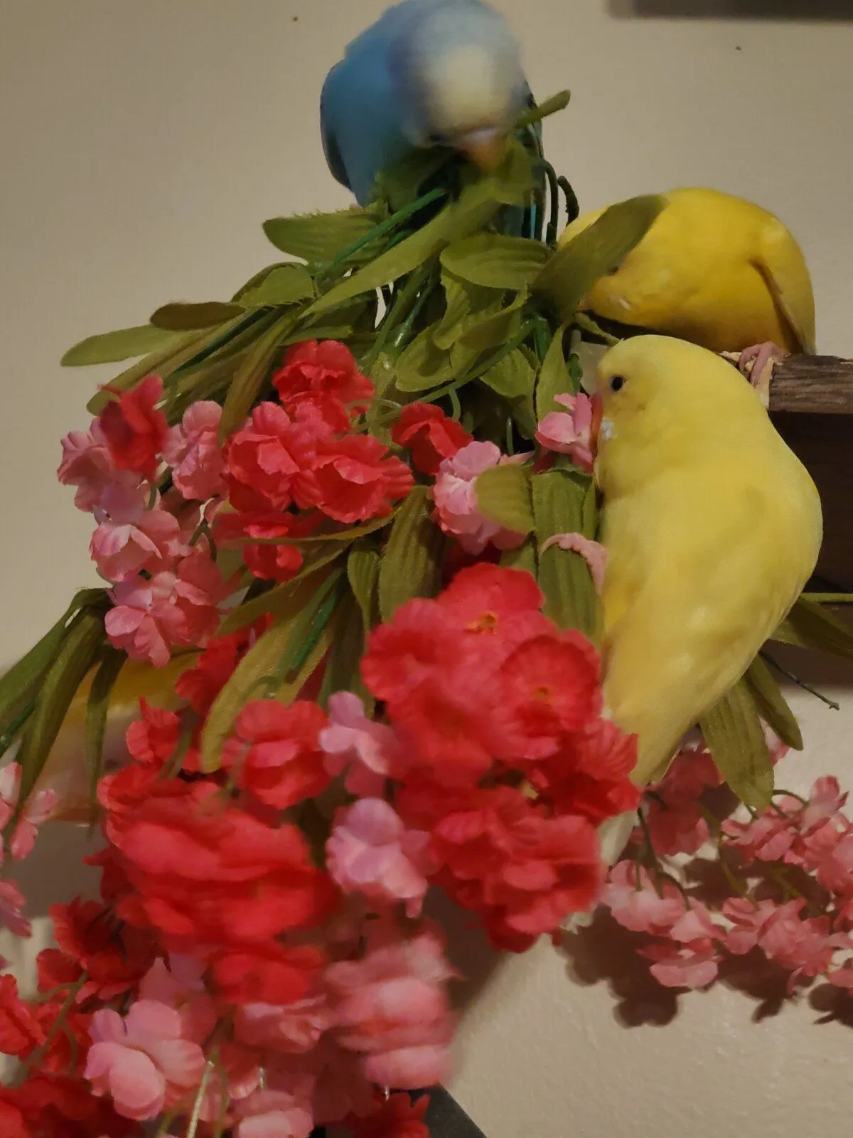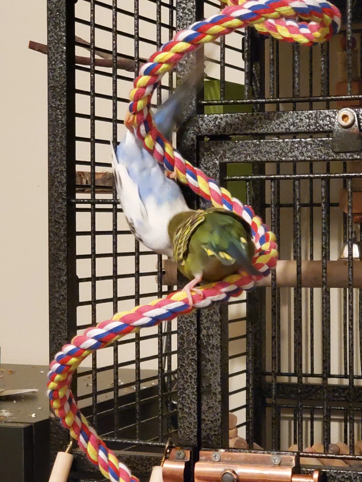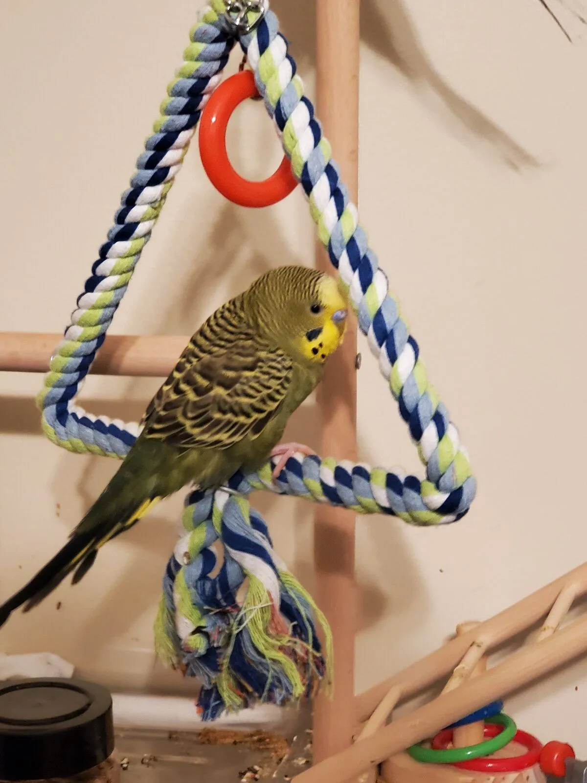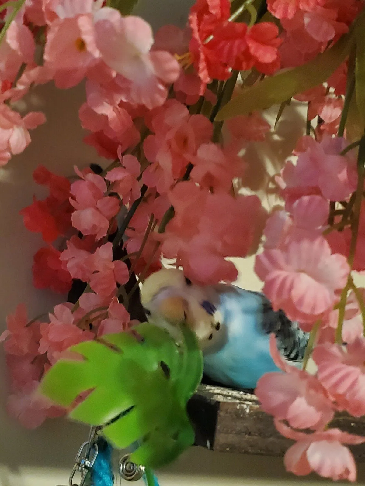 Here is some photos of my budgies playing in my room. I've been setting up a budgie room so they're playing with my stuff. These are not their cages, they're just used for playground purposes! Most of them came with the rehomed budgies.