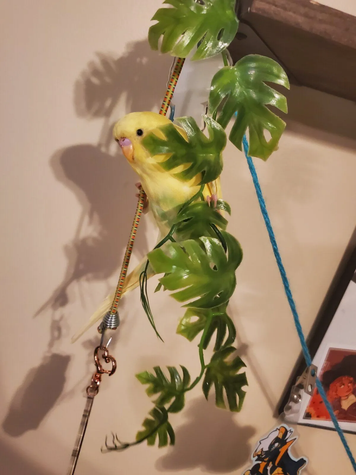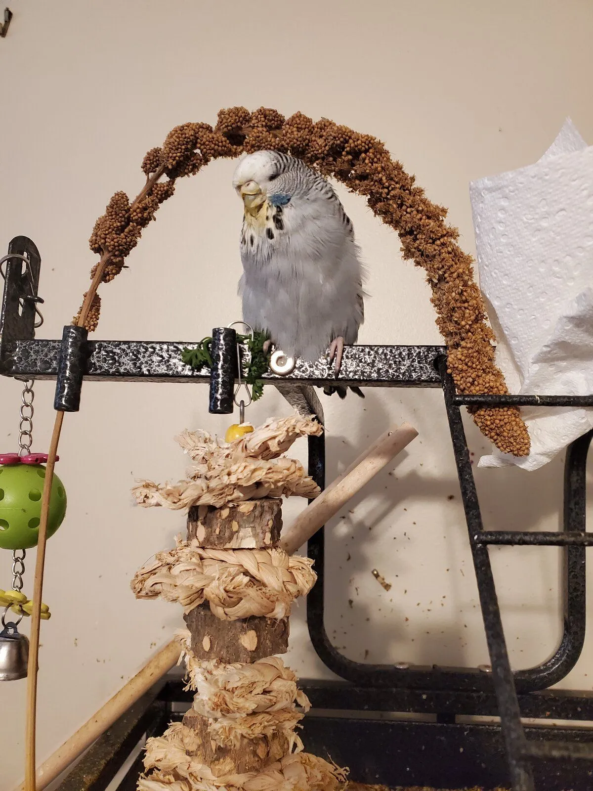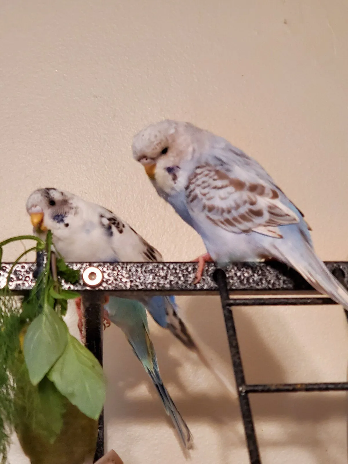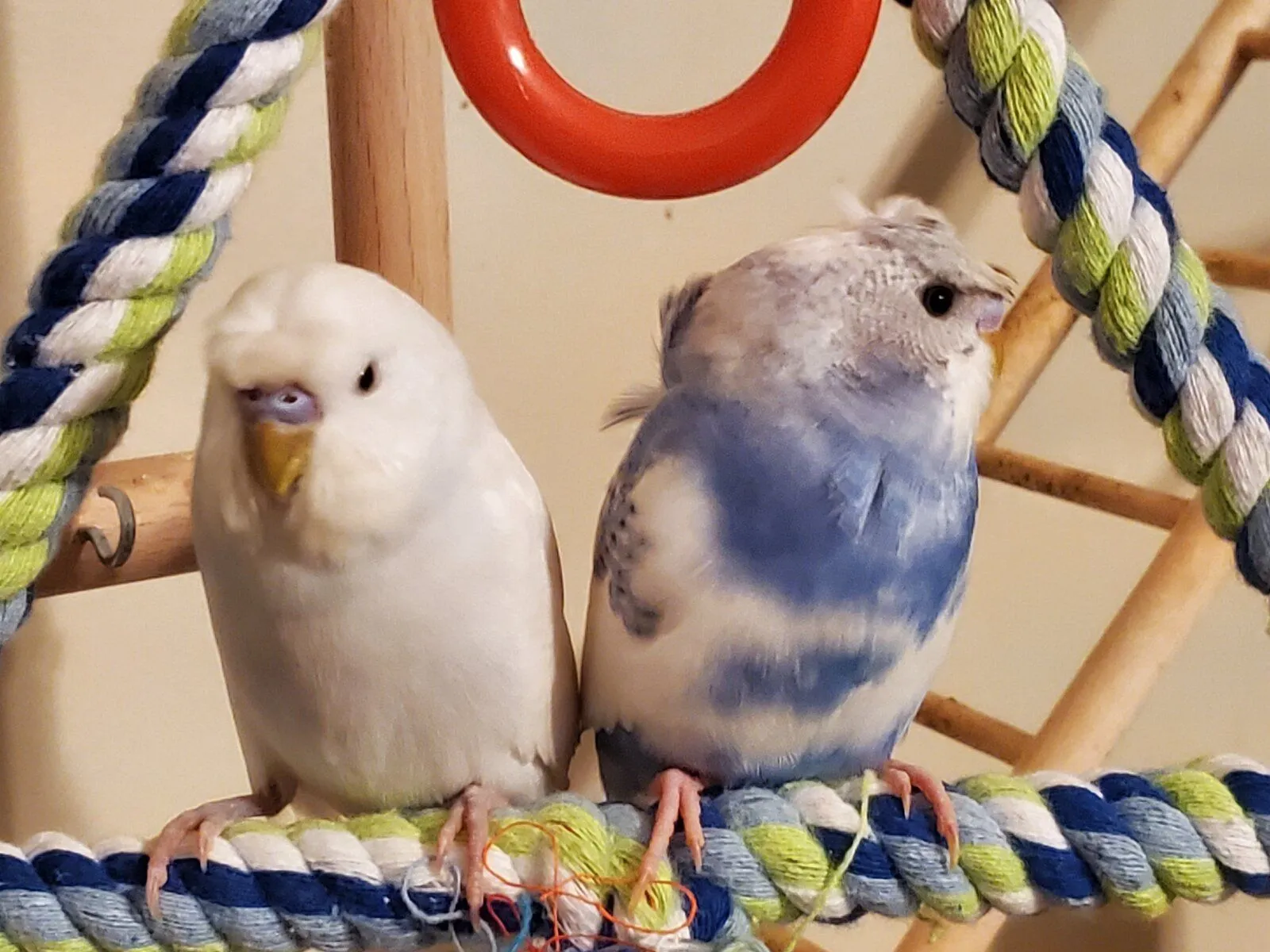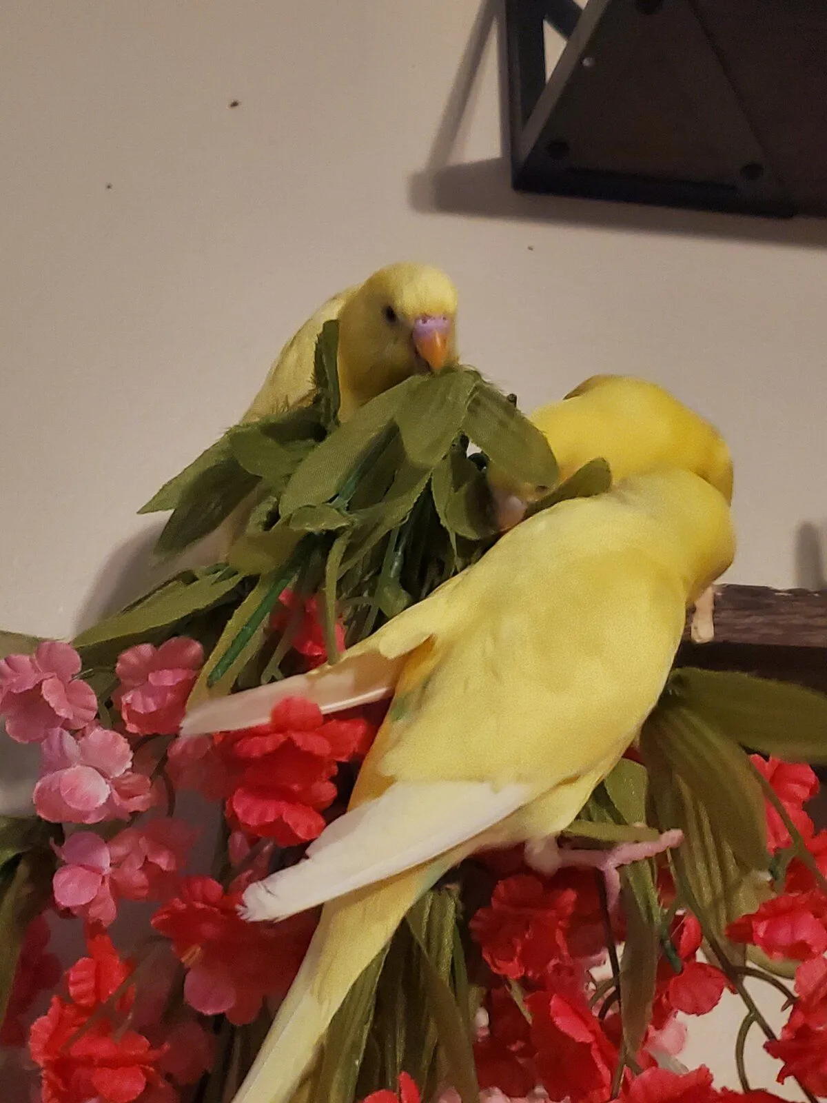Here is some photos of my budgies playing in my room. I've been setting up a budgie room so they're playing with my stuff. These are not their cages, they're just used for playground purposes! Most of them came with the rehomed budgies.
