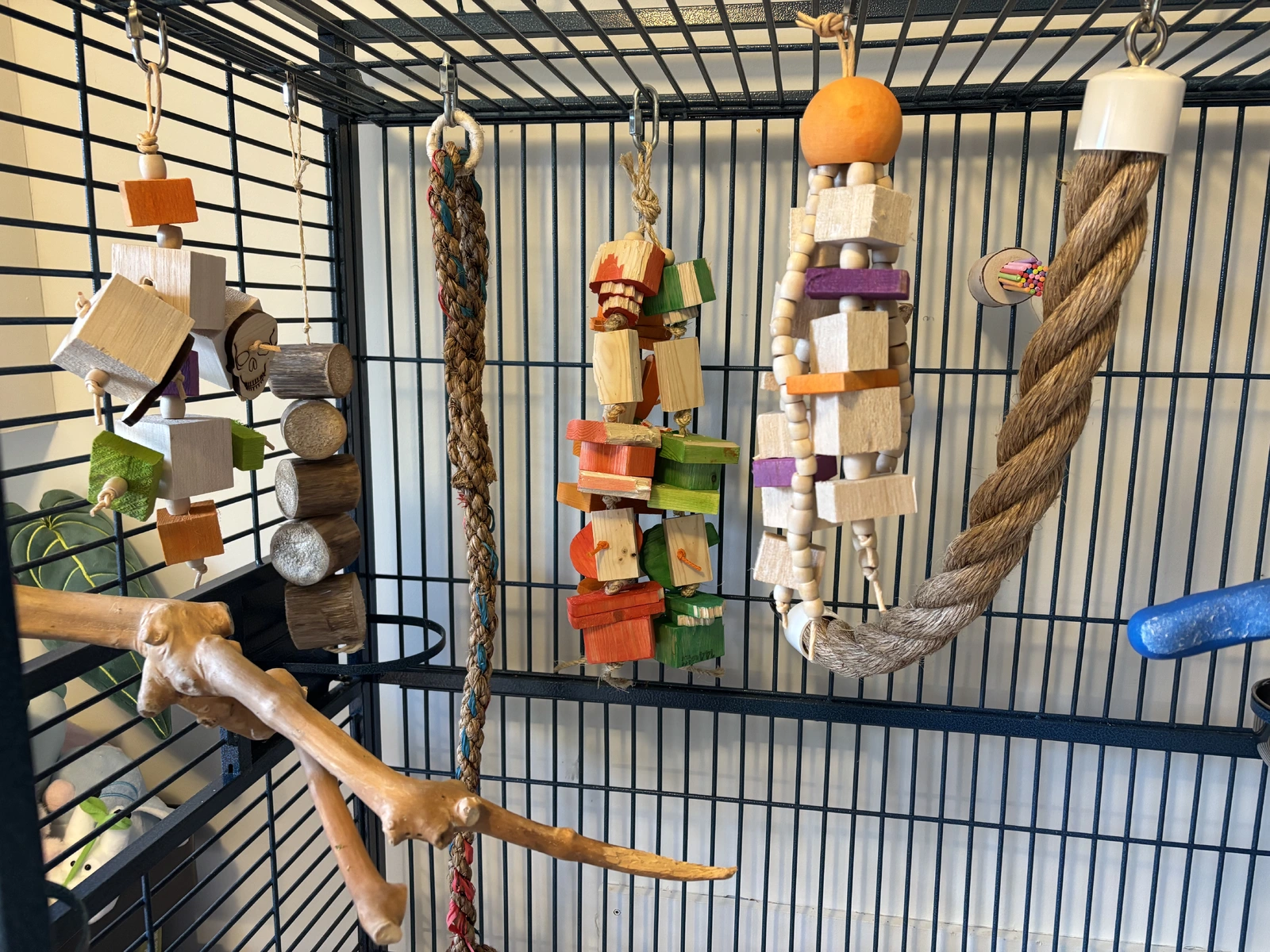 We came home to our birds a few days ago, and everyone is getting settled in to their normal routines again. As expected, both Button and Ava were overweight and overstimulated for a couple of days after coming home. I sent a bit of extra food in the pellet portions to make sure nobody was hungry while we were away.