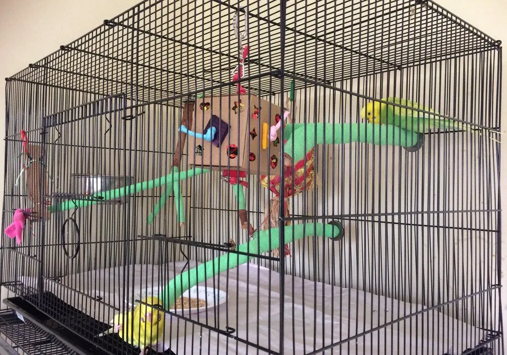 When he begun to develop pressure sores/mild bumblefoot despite a variety of natural wood perches, I decided it was time for a setup designed just for him. I picked a cage that was low in height so that he never fell far, but I pick one with a decent amount of width and depth so short flights could still be done.