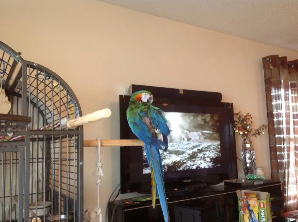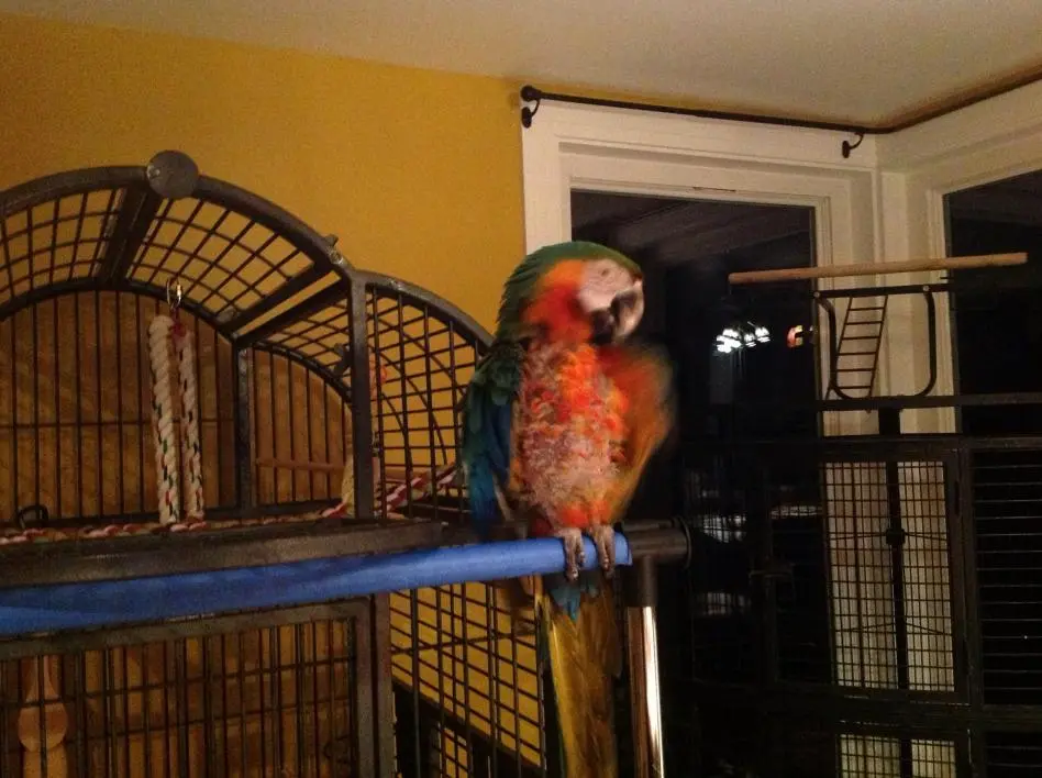 This is Pepper (formerly Karma) who announced her name was Pepper, so we have been using that. We were told she was a blue and gold but she has too much orange and red on her new feathers as she had plucked herself nearly bald before we got her. Any ideas from others would be appreciated. She is still and evil green chicken who bites furiously and will only step up when she thinks it is her idea!