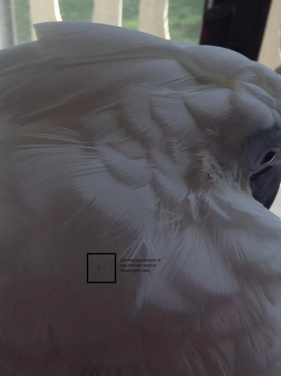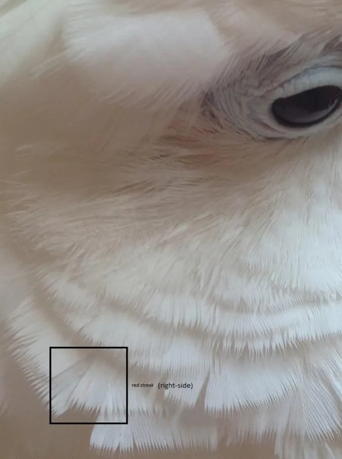 I also saw two red spots on her feathers (and I attached pictures of those as well...."zoomed out image of another red spot" is a zoomed out version of "another red spot"...IN TOTAL, 2 RED SPOTS (DIFFERENT) +THE WING FEATHER: