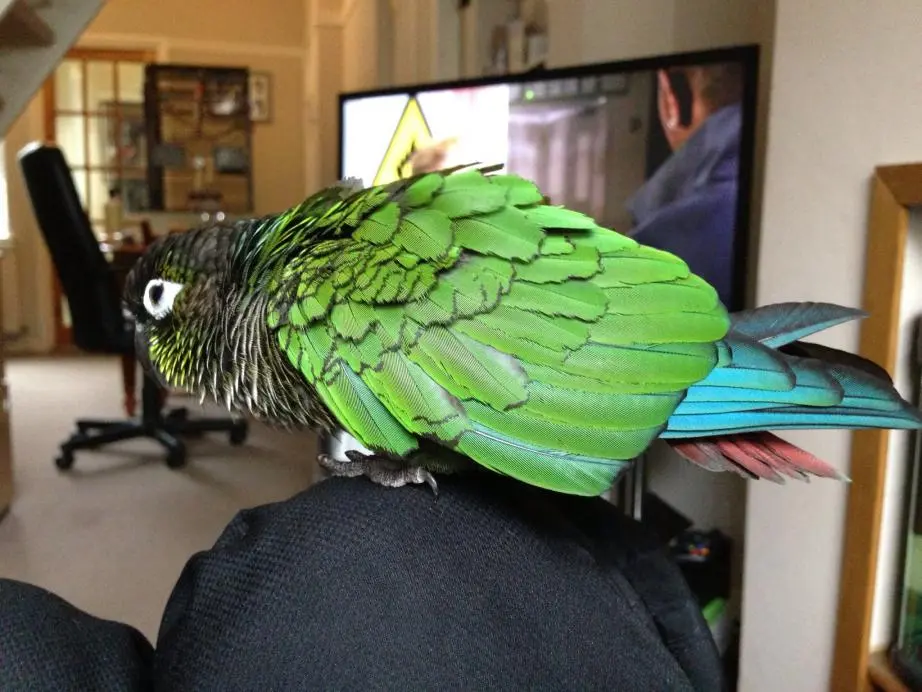 Hi I have a new rescue green cheek been with me for 5 days. I'm a little concerned over the state of her feathers, I've tried to attach a photo, hope I was successful. She's 12 years old and was on a sunflower seed and dried fruit diet. She's now on a much improved diet. Her feathers are all rough looking around the edges, not smooth lines like they should be.
