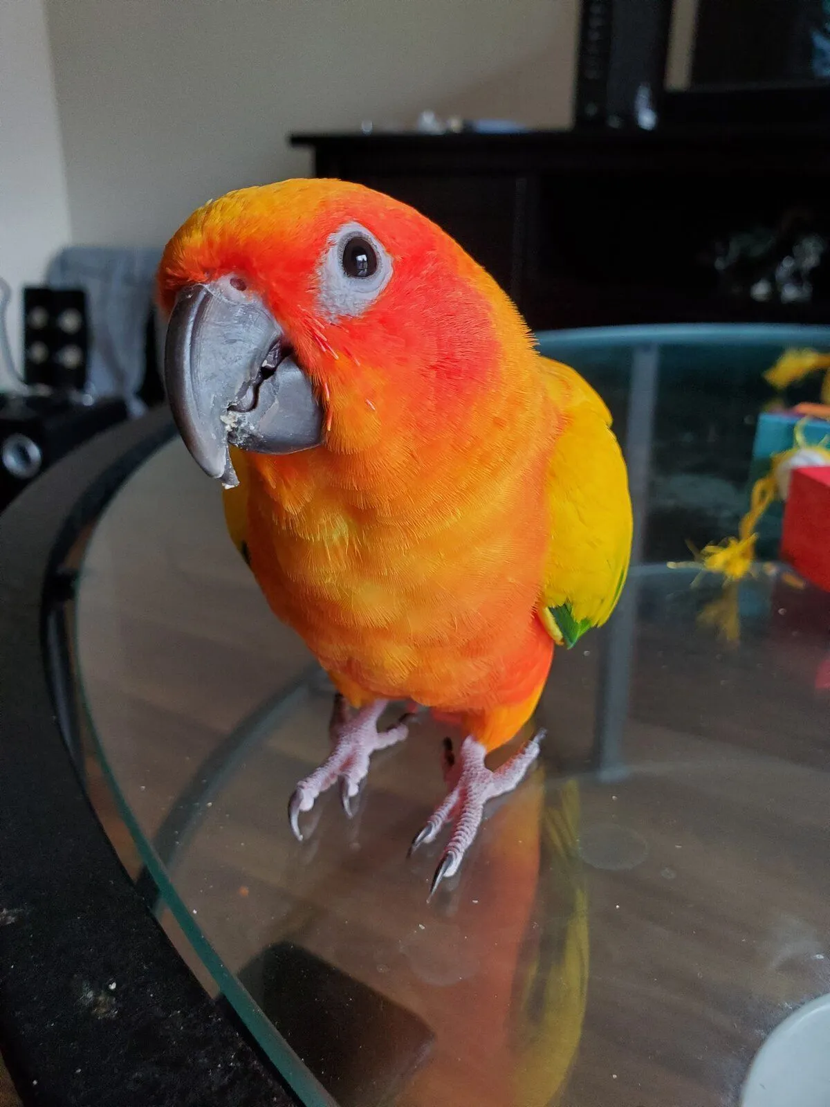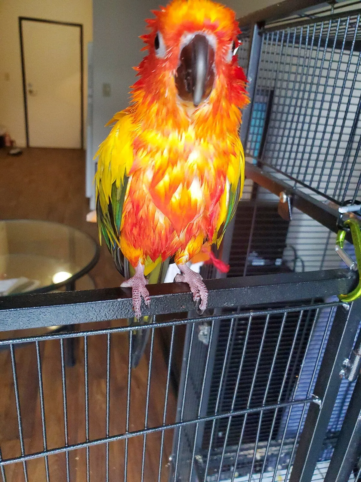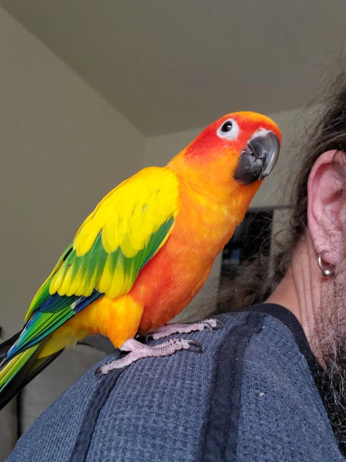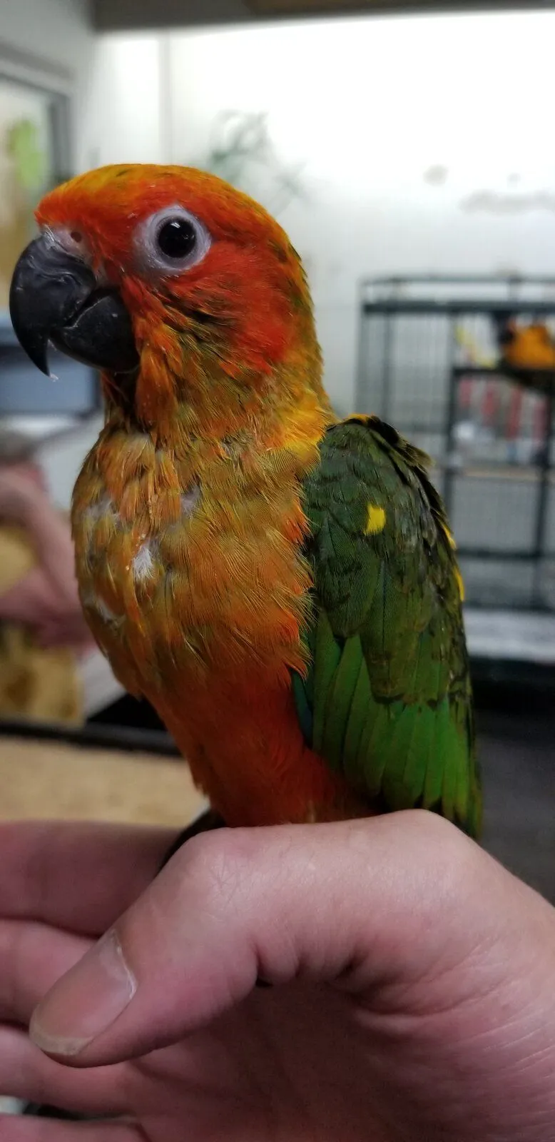 This is mango! I went to a pet store last summer and he picked me. I would walk up to the cage and he would try to get to me as close as possible, so I could pet him. At the time I was not ready to get a bird. I would visit him every weekend. One weekend after I was visiting him I was on my way out and I heard the saddest chirp from him as I was walking out. I immediately turned around and got everything I need to take him home. I had other taken care of other birds (parakeets and doves) when I was younger but was a little nervous to take him in. The moment we got home it was an instant bond. Fast forward to now he is a silly, sassy, cuddle bug. He has taught me so many things in life. I love to watch him grow and show everyone his little personality. Thank you for starting a thread where I could brag a little about my sun conure!
