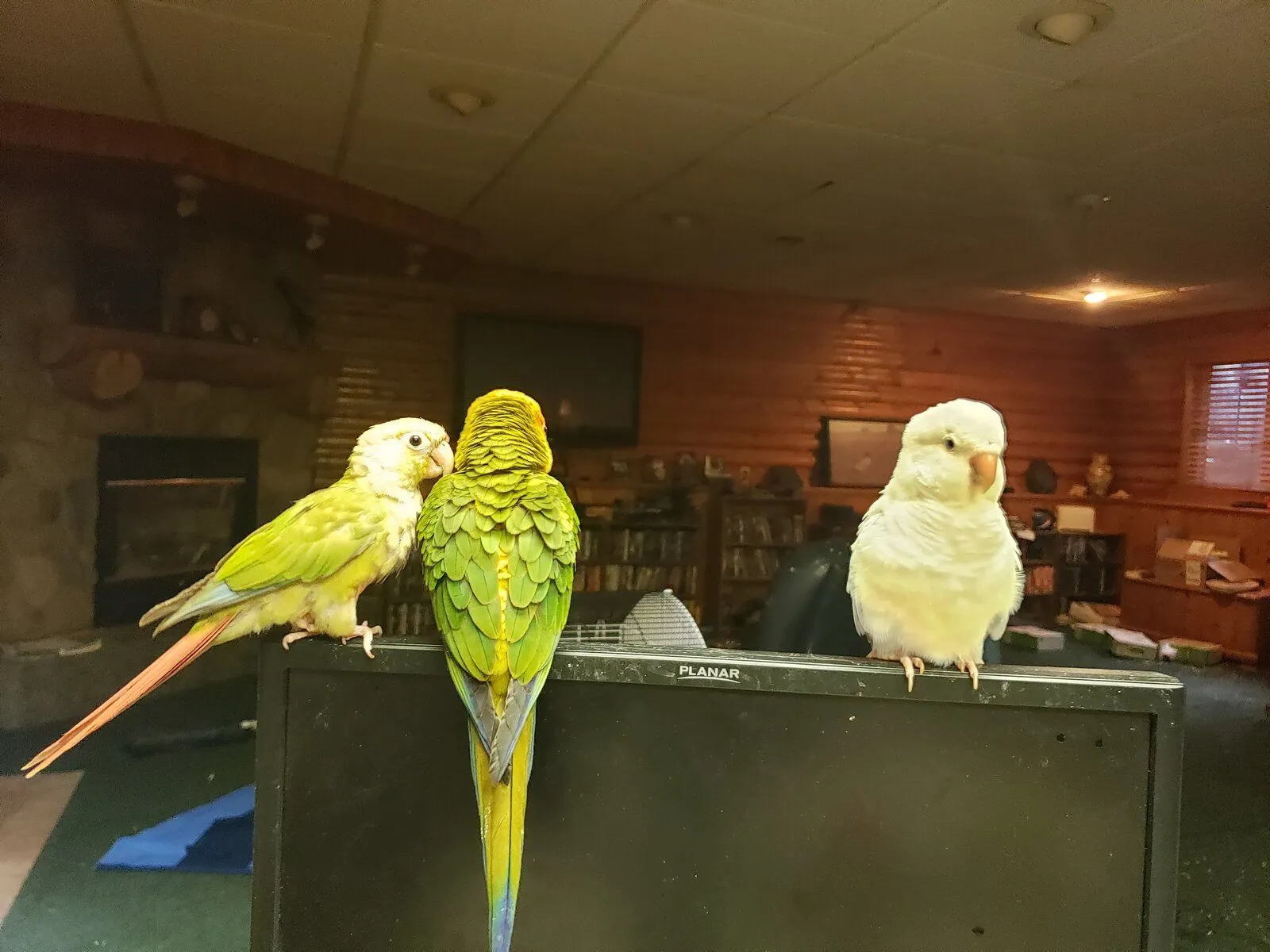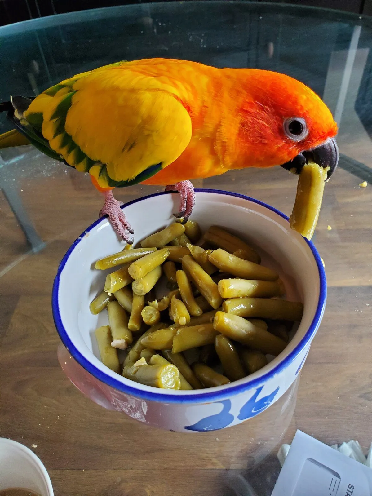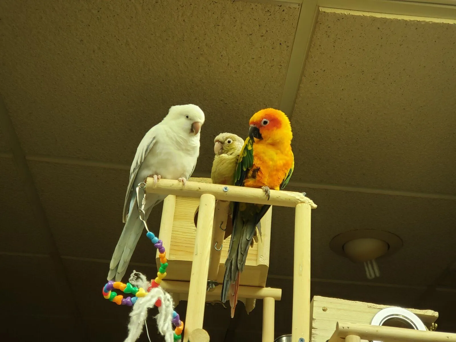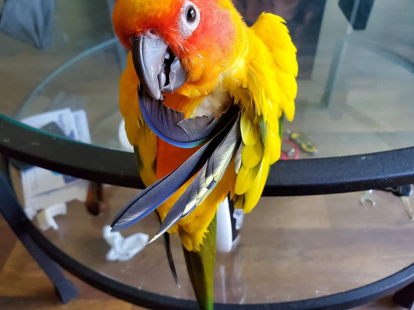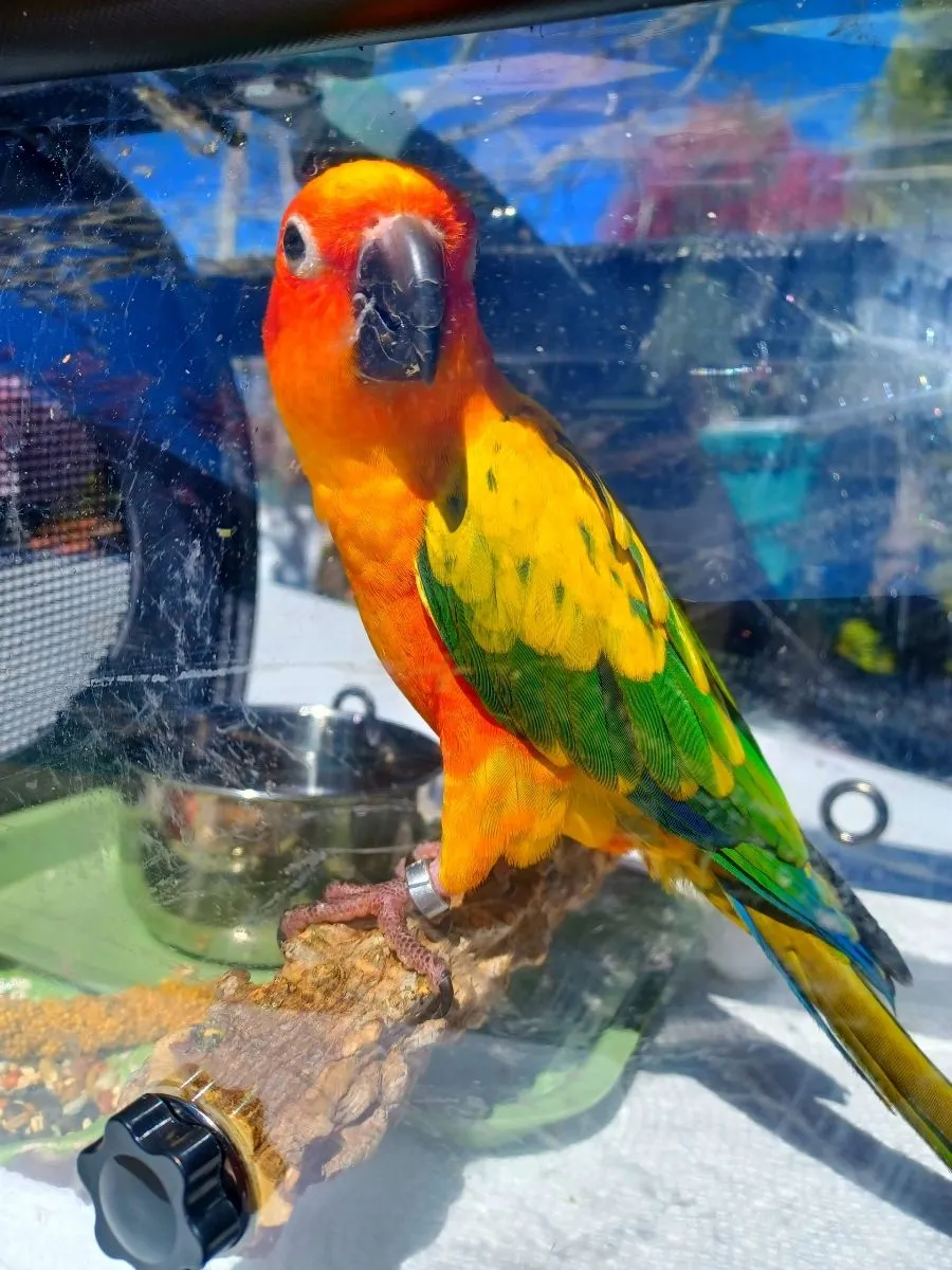 This is mango! I went to a pet store last summer and he picked me. I would walk up to the cage and he would try to get to me as close as possible, so I could pet him. At the time I was not ready to get a bird. I would visit him every weekend. One weekend after I was visiting him I was on my way out and I heard the saddest chirp from him as I was walking out. I immediately turned around and got everything I need to take him home. I had other taken care of other birds (parakeets and doves) when I was younger but was a little nervous to take him in. The moment we got home it was an instant bond. Fast forward to now he is a silly, sassy, cuddle bug. He has taught me so many things in life. I love to watch him grow and show everyone his little personality. Thank you for starting a thread where I could brag a little about my sun conure!