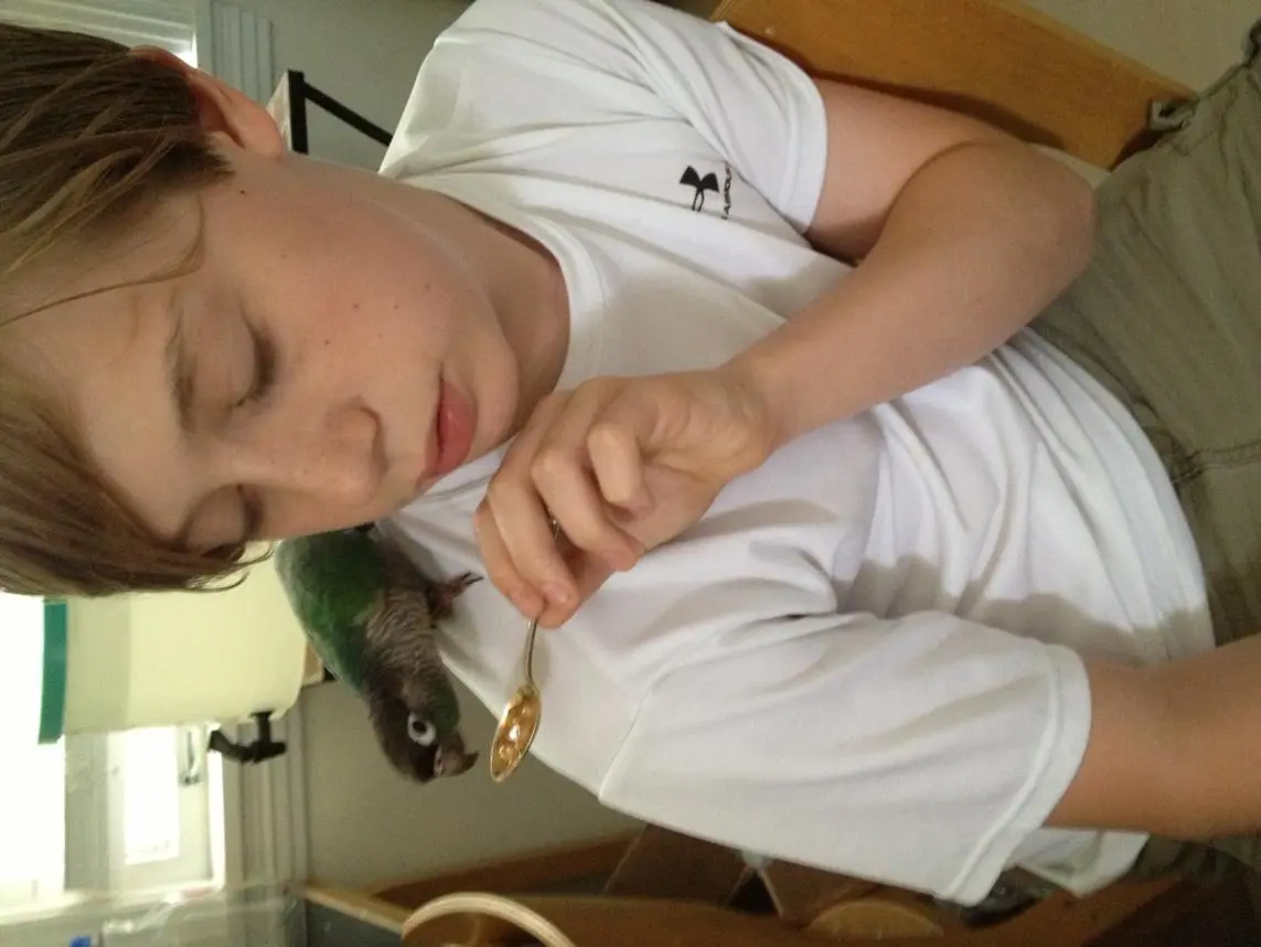 Meet Cyrus, my son's new love. We adopted him from a home with too many birds, and he didn't have a friend. He is a two-year-old turquoise GCC. Here, Henry feeds Cyrus peanut butter (organic, with flax seeds) from a little silver spoon. Really.