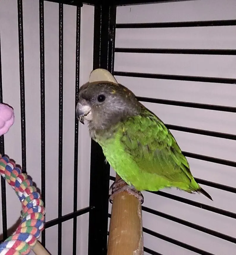 Ok guys.... so.... this is gunna seem out of nowhere but I've actually been struggling with this for a few weeks and finally made my decision! I went and interacted with a Brown Headed parrot a few weeks ago, young, about 11 months old at a local pet store. He had been there for months and all the customers would walk right by him and B-Line it to the Sun Conour beside him about 4 feet away. I had been the ONLY customer that had paid any mind towards him and actually asked for him to come out to be handled. One of the employees said that whenever anyone came in they would go for the "prettier birds" like the Sun Conour and budgies and would only take 2 or 3 second to look at him because he wasn't as pretty or active as the other birds, which is just plain not fair to him! He has a single white tip of one of his toes including the toe nail and yellow speckling on the back of his head! Beautiful brownsih grey head with a gorgeous green body! And a beautiful personality to match his beautiful stunning looks! It depressed me that no one would give this wonderful bird the time. Then I started feeling guilty that I was getting a new baby Meyer's already in a great home/breeder and I knew she would be sure he went to nothing less than the perfect home because he is the only baby in the house!! She may even keep him I think actually. So, I texted the breeder and told her what I decided. This wonderful brown headed was being forgotten... they are wonderful birds that deserves more!! The pet store even lowered the price of him to 50% off because he had been there for soooo long!! Yesterday my mind was ALL OVER THE PLACE on what to do, and when I decided I would take the Meyer's my heart would drop and my conscious would tell me "HOW COULD U!!"... to me that is a BIG sign that I need to give this beautiful parrot the home he deserves and the attention and love he deserves!!! Yesterday evening I left to go pick him up and brought him home. His name is Marly. He's still very nervous, even this morning.