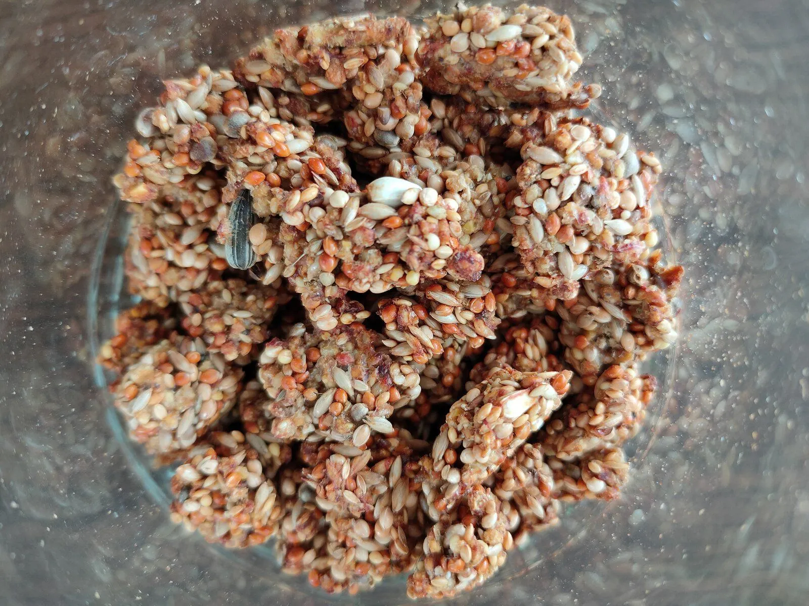 Mash the banana, add pellets, add seeds, mix. Pellet crumbles are also excelletent as they suck up the extra moisture. Keep adding either of the two until you see you can start forming little balls. Mine was still bit soft so I used tiny spoons to shape. Put on a baking paper, let it bake at 110-120 °C for around 20-30 minutes. My oven has the hot air function which was perfect, idea is to more like dry the fresh treats. Bonus for those who have fruit drying machines, that'd be perfect.