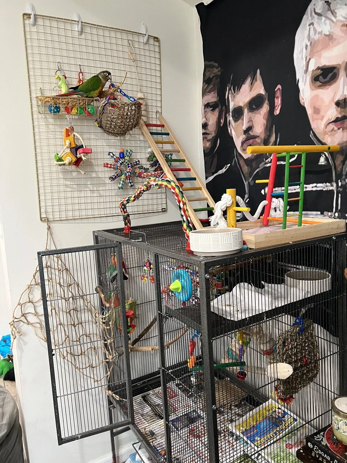 my best friend has a lot of budgies and she made a wall playground for hers with cage bottoms. i got inspired but bc i have a conure, wanted to go a bit sturdier. so this is what i did!! all in all, buying new toys, materials, and treats to shove in it, i spent abt ~$80 bucks. but im sure u can do it for loads cheaper if u already have extra toys n such laying around.