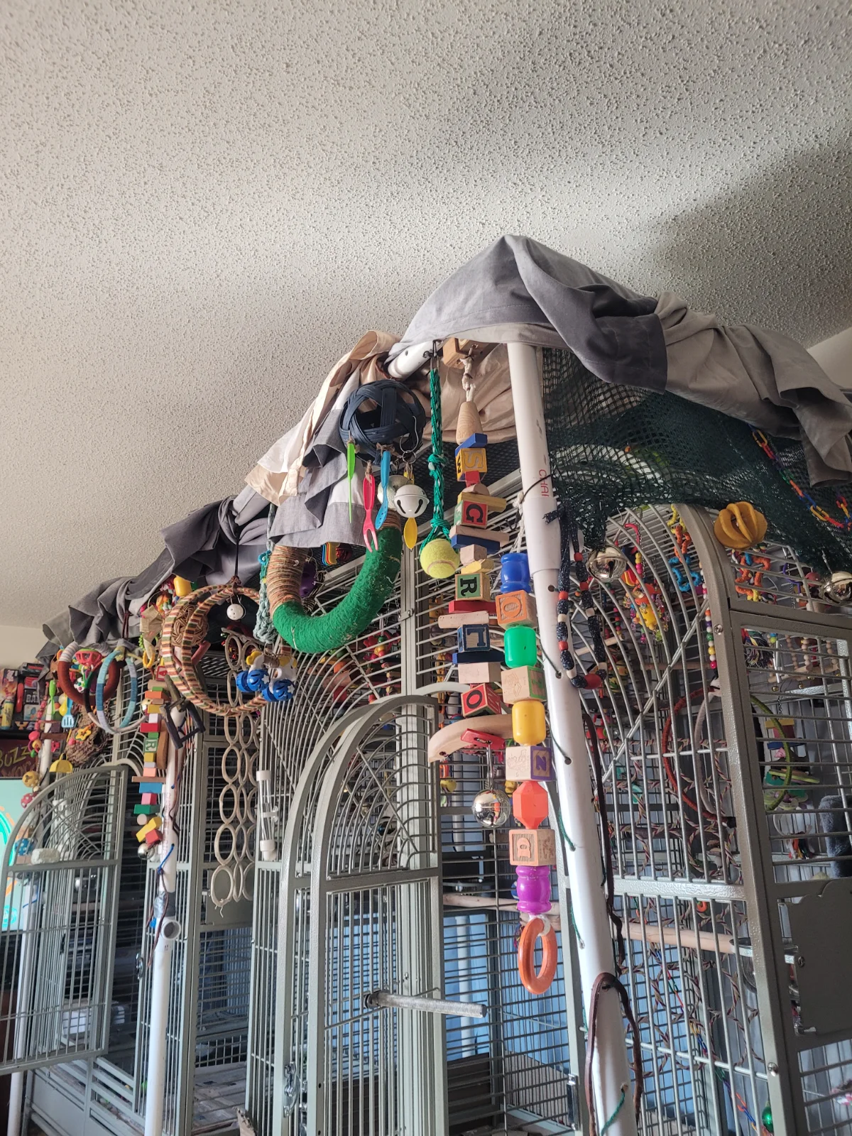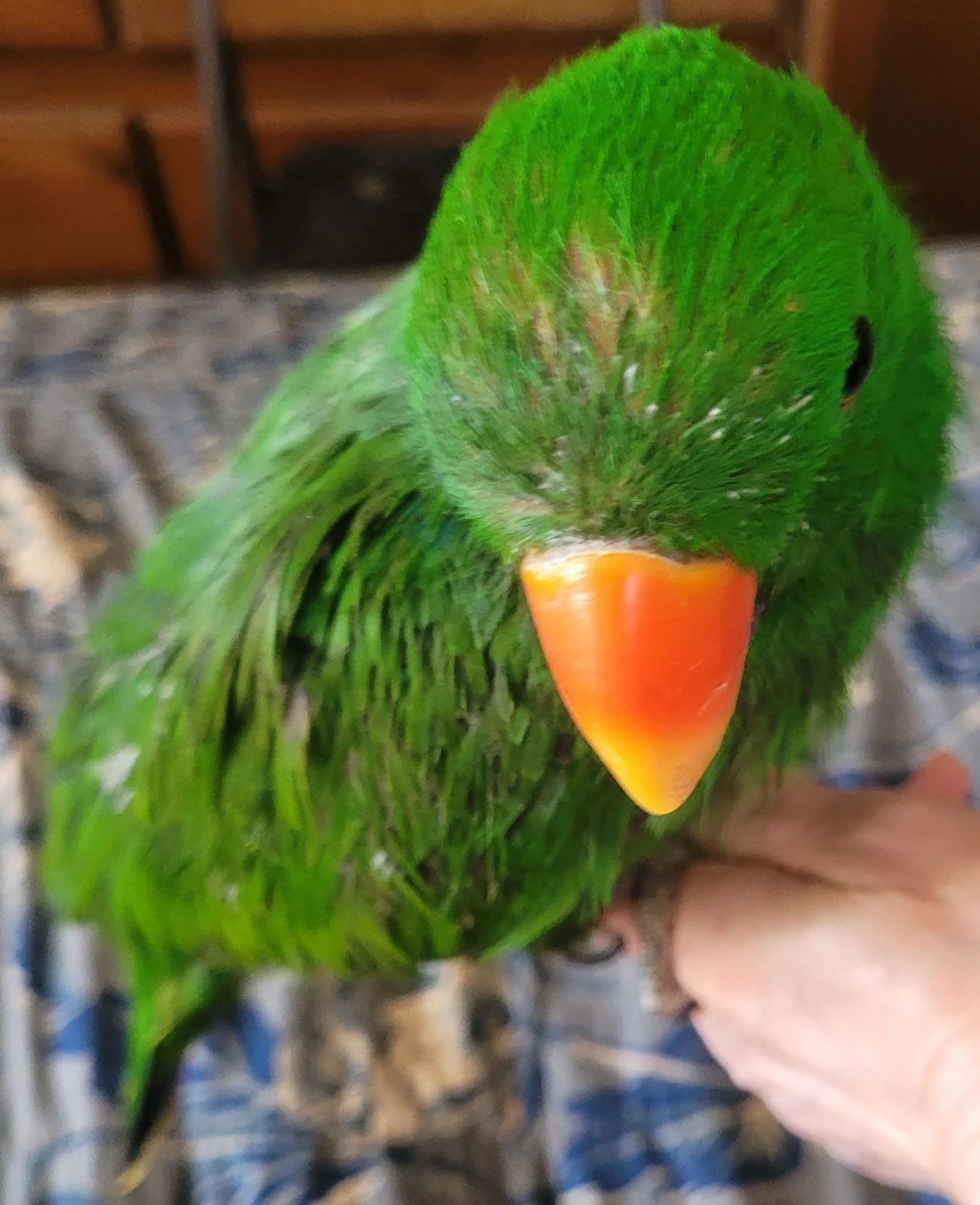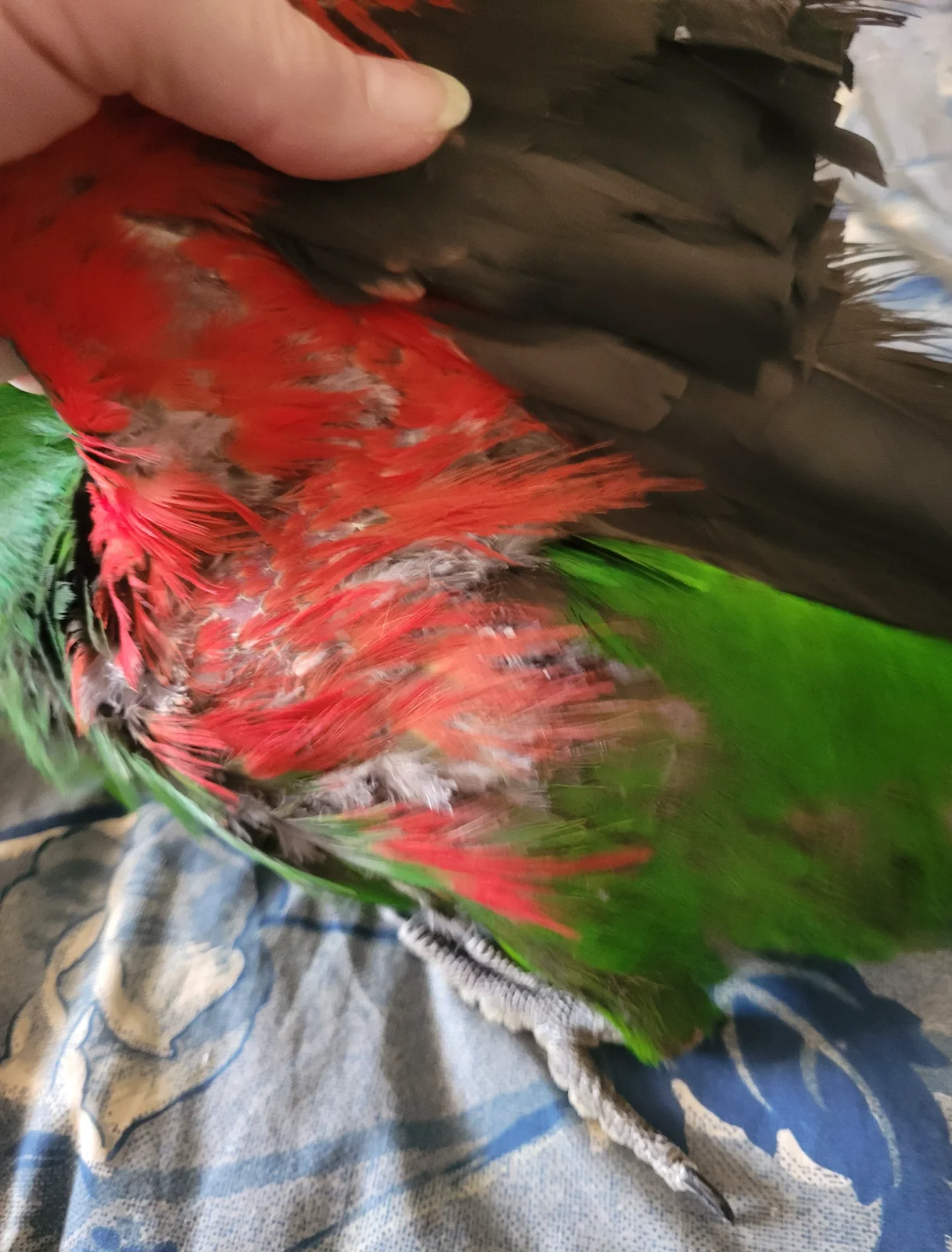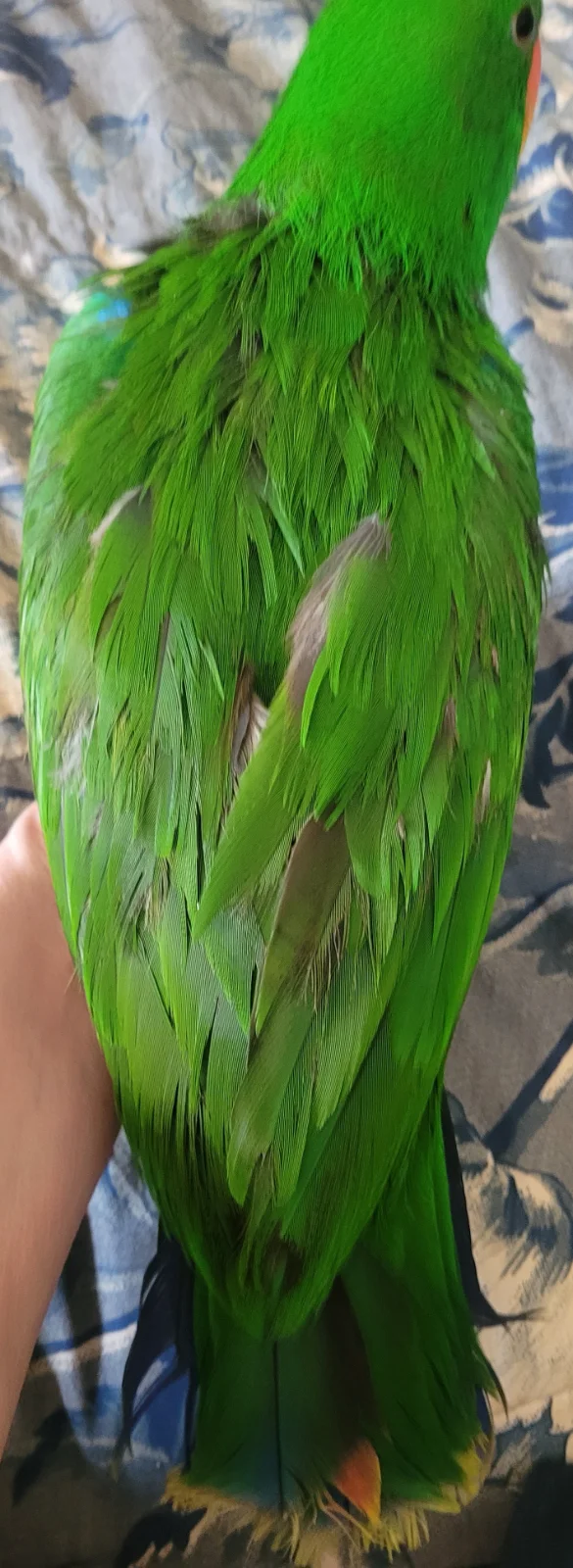 I have a question about my eclectus. He has been chewing his feathers for about 3 weeks. I find little feather strings on bottom of his cage every morning. He does it at night. I've taken him to two different avian vets. They both have said the same thing. He been treated with ivmiten? That mite medicine even though they said he has no mites or lice. They said it's ether stress or hormonal. He doesn't act hormonal and he doesn't act stress. He is out of his cage first thing in the morning and goes in his cage when he wants to go to bed which is around 4:30-5 pm. I cover the cages up, black out certain. Vet said give Bach Rescue Remedy at night so I have. Hasn't helped. He eats fresh vegetables in morning and pettets during the day and Nutri berries as treats before bed. He is almost 7 years old. I have a 1 year old female eclectus also. They're is separate cages. He's getting very thin almost naked. I mist him every other day and bath him once to twice a week. He has a lot of balls places when I bath him I can see. He doesn't lose any features at all just the tiny strings. He's very sweet. Not regeratating or rubbing. He's talking and eating good but has lost about 2 to 3 g of weight a day for a week now holding at 367 grams down from 400 gm. He's not sick. This is my birds cages they are huge and they have a huge jungle gym covered with toys jungle gym is 11.4' x 4' x 6'. 11. I have two Double king size cages with the deviders in them. So do you have any idea what could be causing him to chew all his feathers off? His pellets is a mix of Roudybush, Zupreem Natural and Lafeber pellets.