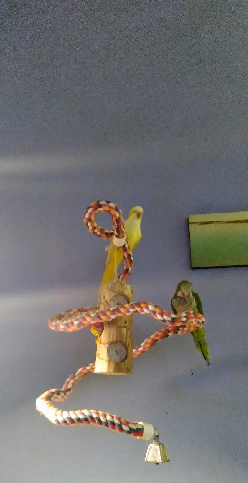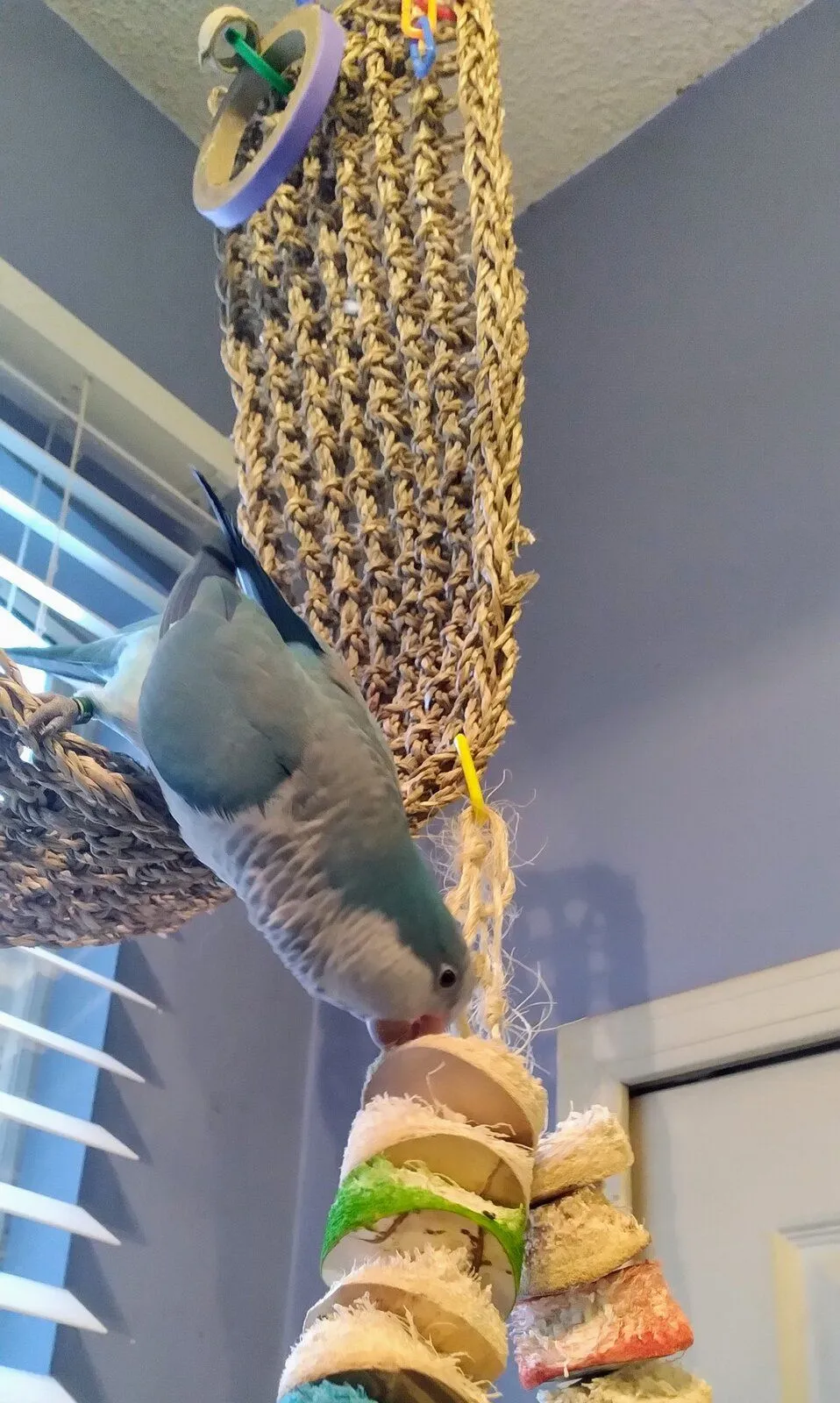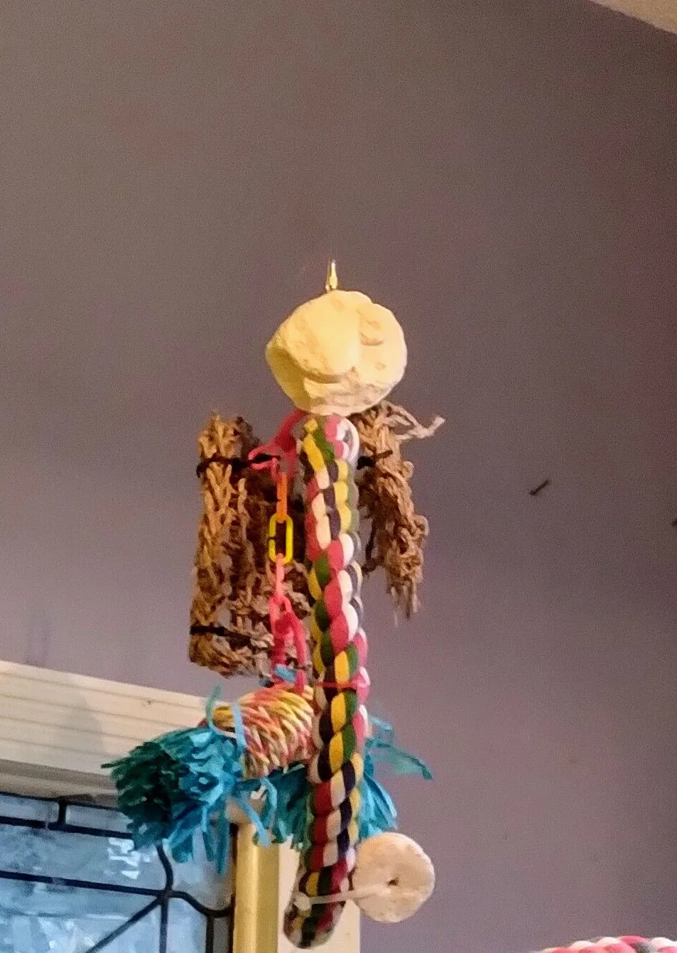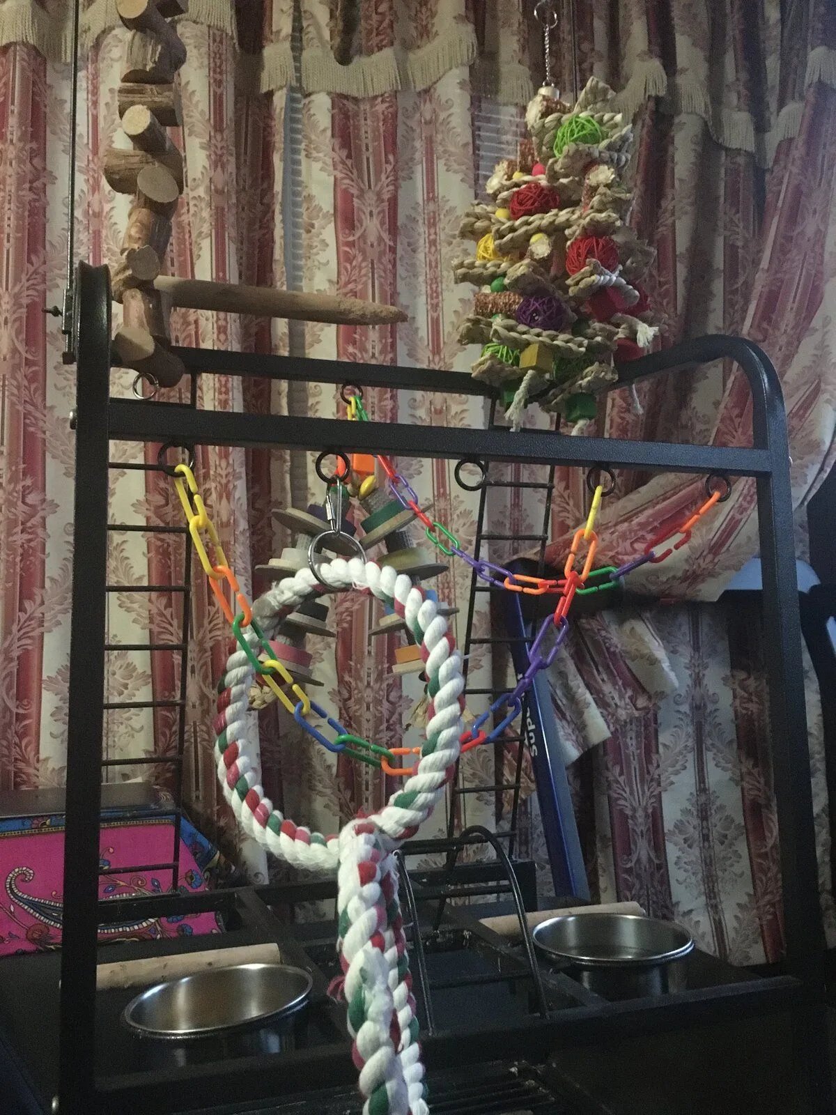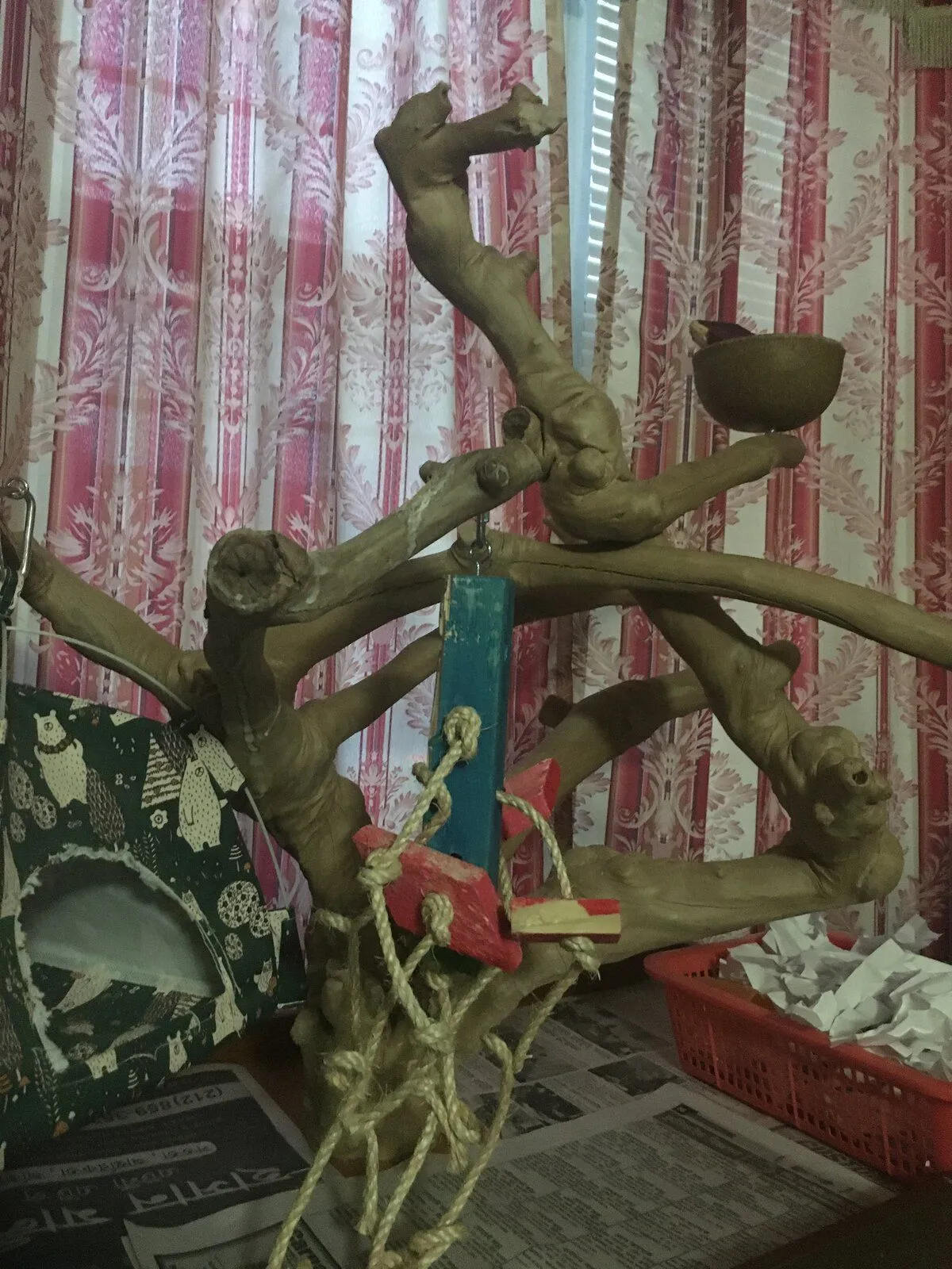 I just made the tree by cleaning some branches I found outside, nailing them together, and putting the bottom of the tree in a holed-out piece of firewood. I had another tree, a tabletop one I made, but the burds quickly destroyed it. The tree is usually replaced every 2ish years.