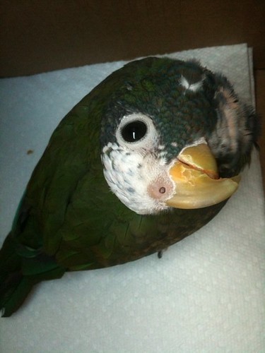 Anywho! About Petrie... He was born 4/7/2010. So a little over 6 months old. He's an amazing little guy. The breeder had him DNA sexed along with some other tests. He is a White Capped Pionus parrot...and currently the love of my life. I've only had him for 3 days now but he's amazing.