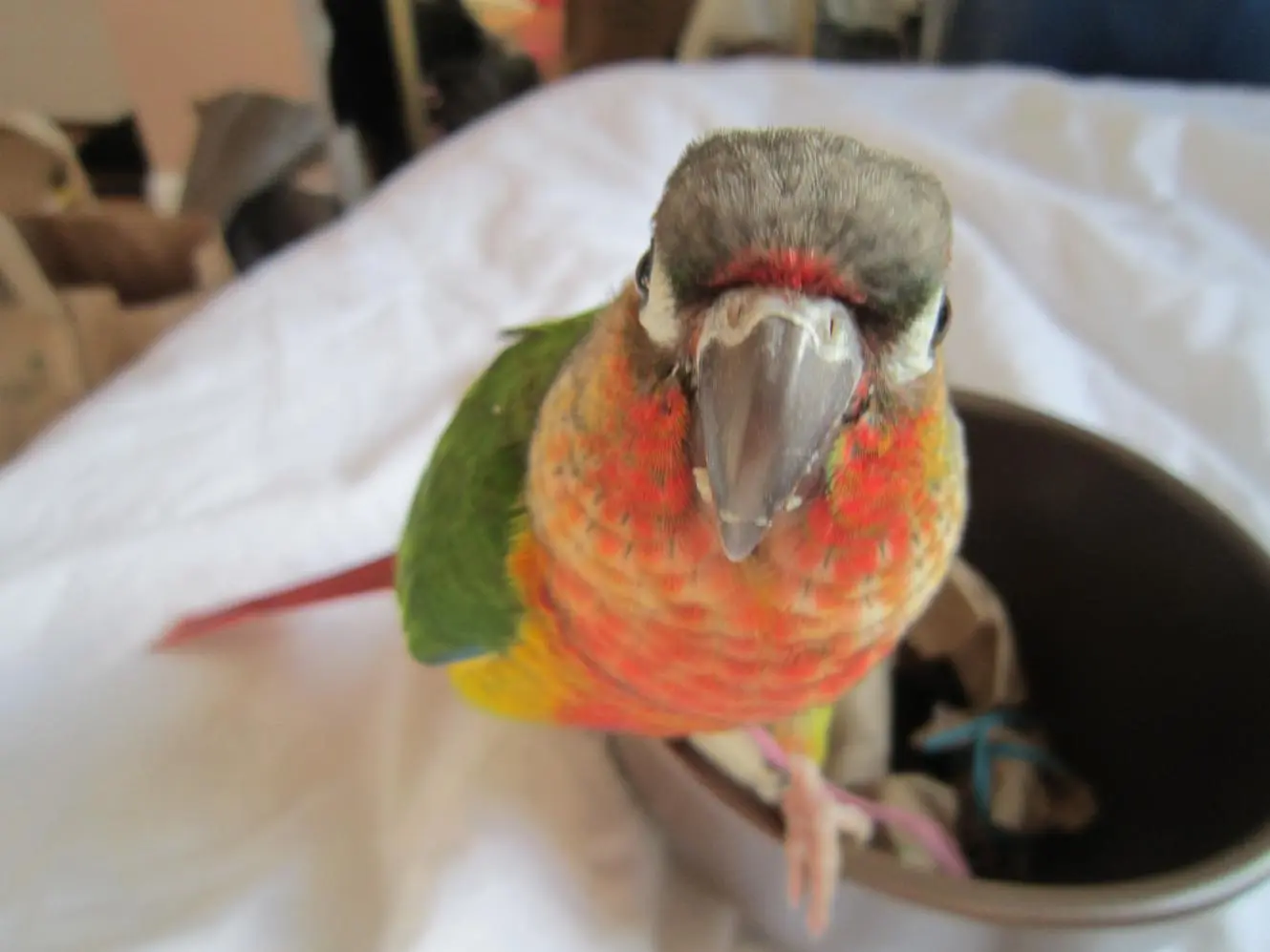 I have that same problem with Aleta. I gently I blow on her so she moves away from my lips, but then she will put her foot up onto my lips, as if to shush my blowing.She sits on my chest and nibbles at my lips, which is very cute but also sometimes kind of intrusive...if I open my mouth she climbs right up in there to clean my teeth!