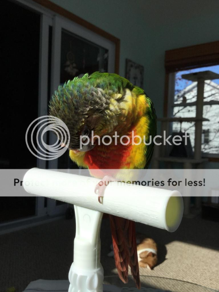 Baby is doing so good in training he love for me to give him head scratches and to scratch his beak. He has almost completely stopped biting hard and always wants to be out on my finger. I am amazed at how much progress I have made and it's only been a week. As I'm typing she is sitting on her perch in the sun scratching herself around her head and neck with her own foot !