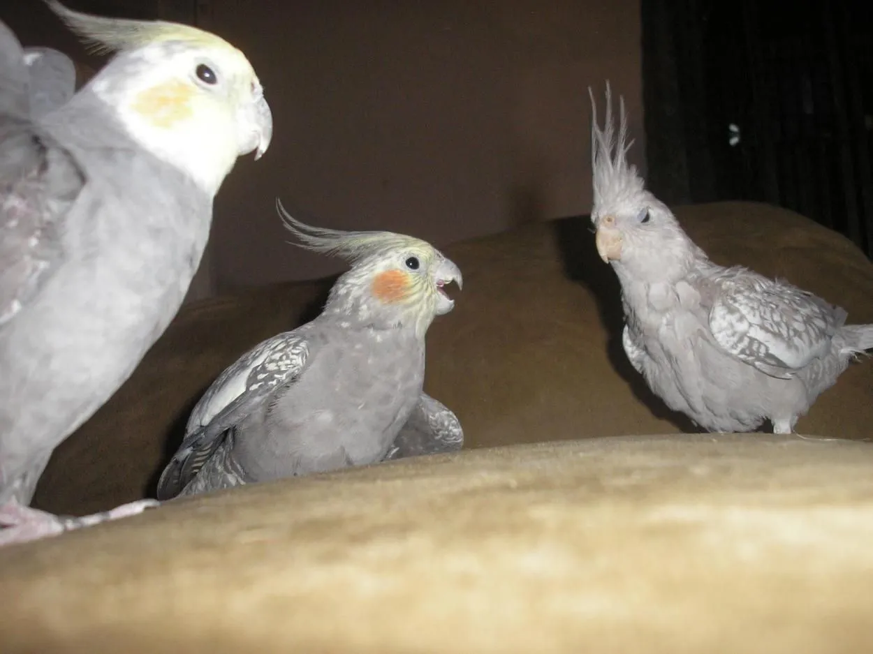 Gizmo and Pearl the cockatiels are working the nest box! They kept having eggs in the food bowl so I put the box in. It's funny because when people fall in love with my birds and want one I always tell them (after the HUGE responsibility rant!) to start out with something smaller to get used to the idea. Then they ask where they can get one and I tell them either a rescue or wait for Gizmo to have his yearly babies. So I've got a 2 person waiting list on a pair that either has (1 whiteface cinnamon pearl) or (1 low pearl cinnamon, 1 high yellow pearl cinnamon and one grey pearl). I don't know if it's possible for that to happen that way but they've had 4 clutches in their lives and had 2 of each. I let the parents raise the babies full term and I kidnap them everyday for a bit to socialize. They are back in their big cage now that the moving is done. I really look forward to their babies. It's a good way for them to help out with the expenses of their food and toys. I even offer to take babies back if it doesn't work out. I only let them breed once a year and they got 2011 off since things were to busy for them. They are the most prolific breeders too. Also decent parents if you don't mind a little overpreening. Here is a picture of them and "Luna" the wf cinn pearl.