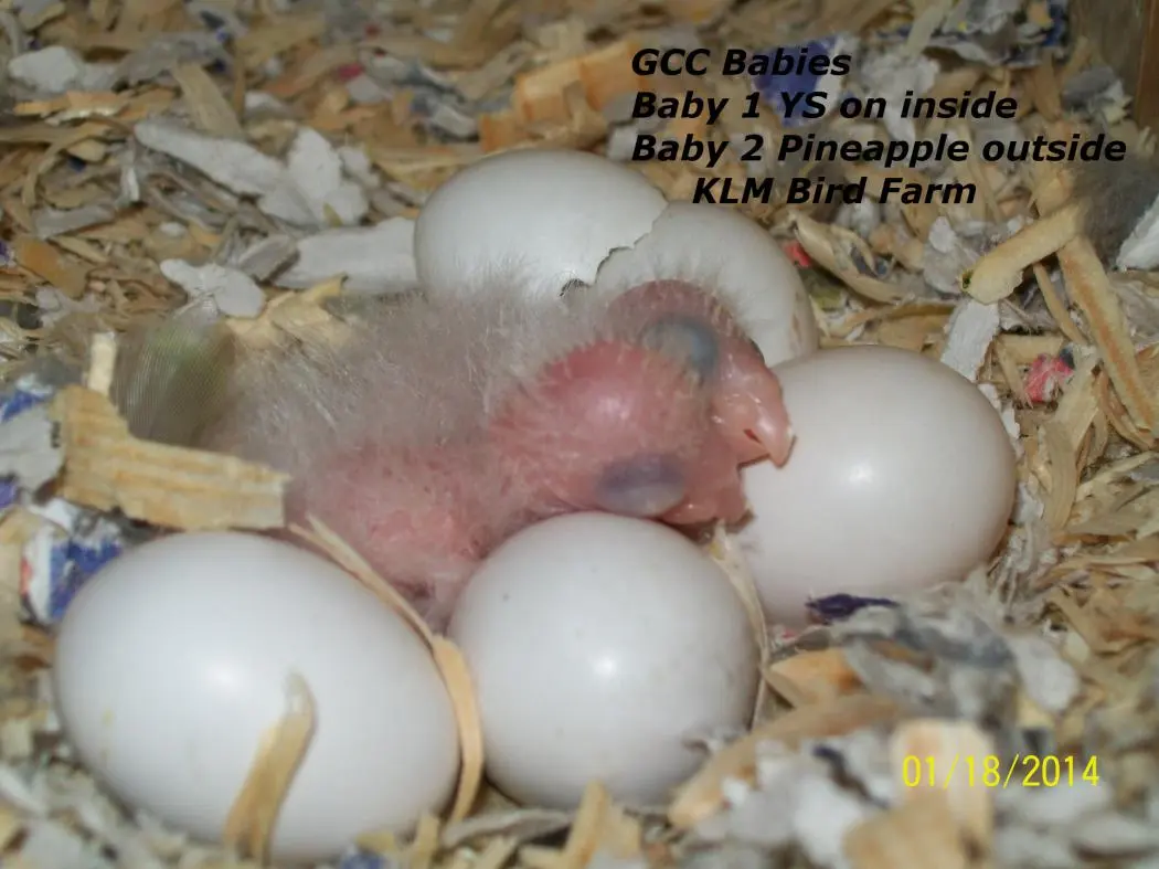 Hello all, I just joined the forum today. My wife and I had a Sun Conure for several years until his passing last March. We have been bird-less since. I am 31 and I started having medical problems this past year. I now work from home and thought how great it would be to have a companion. Just before Christmas, I started looking at different breeders and also for just the right bird. I finally decided a pineapple GC would be perfect for me. On December 26, I found a local breeder on birdbreeders.com. I sent them an email and was delighted to here that they indeed did have a mating pair. Only days later, I was told that the first egg had been laid. I waited anxiously until the first bird hatched on January 18. My wife and I stopped by the other day and we got to meet our new baby. We still have about 4 weeks, I think, before she is ready to come home. I am very ready at this point. Our last minute toys and food items just arrived today. Now we wait...........
