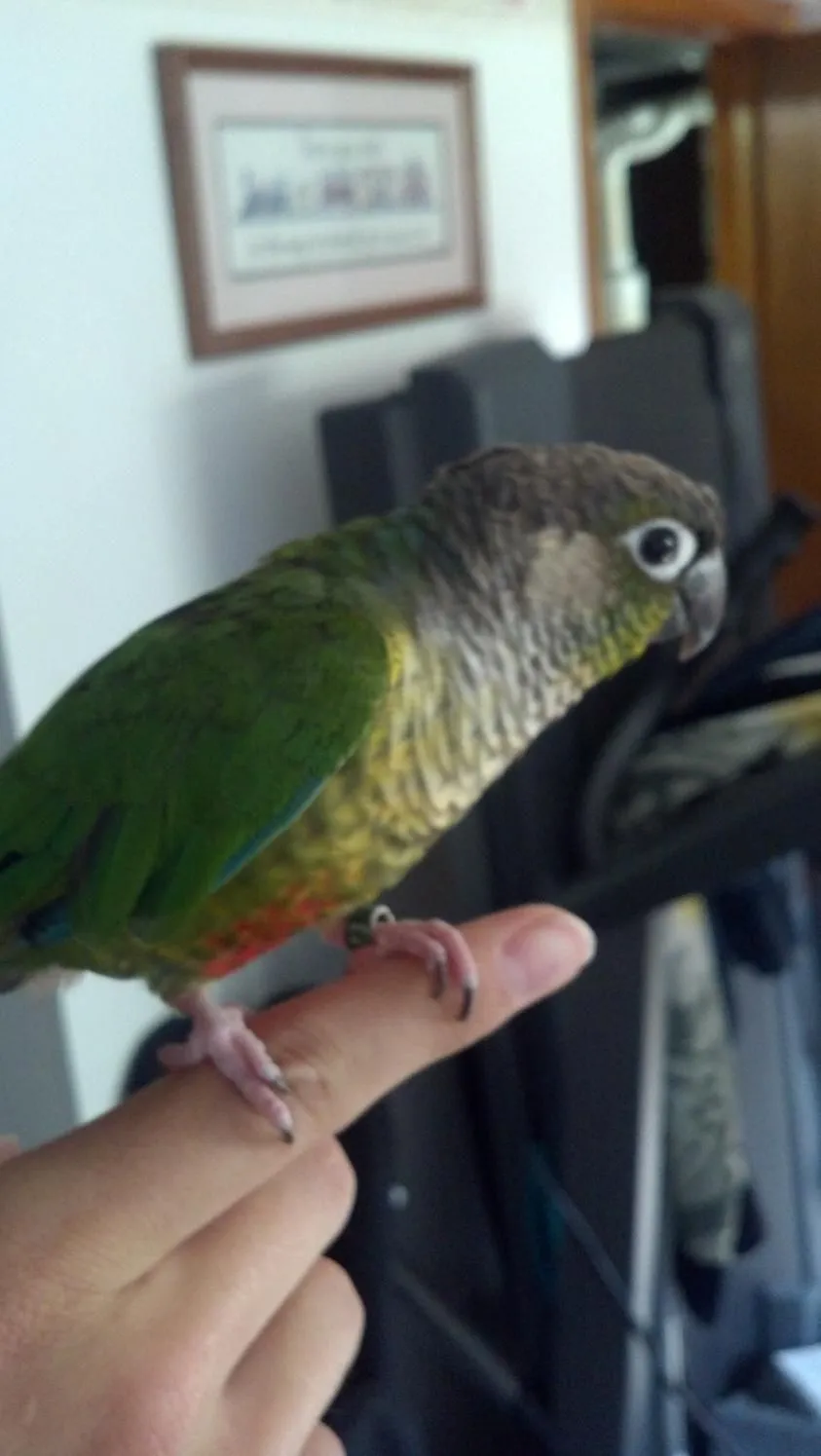 Hello everyone! My name is Tim and I just bought a Green Cheek Conure yesterday (hopefully the picture uploads and you can all see him