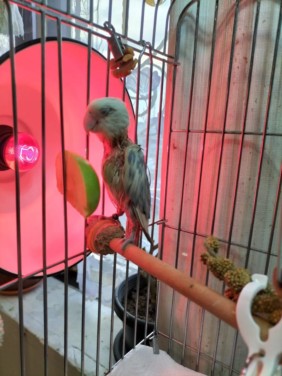 My lovebird, Frosty, has been scratching out his feathers from his crop and tail. His tail was pretty bloody. (Now it's just dried blood.) This has been happening for quite a while now, so we started putting the tonic that the vet recommended onto his affected areas. The tonic didn't work, so we put on some of our own: propolis. This helped tremendously. My other lovebird Mango (who was also scratching out feathers in his tail, leg, and crop area) seemed to start regrowing some of his feathers. Today, one of my relatives decided to put on some extremely excruciating cream on Frosty's affected areas. When another relative saw him, she immediately called me and asked me what was going on: I told her that my relative has put some cream on Frosty. Frosty looked so depressed... We(me and my other relative) and I tried giving him millet, he refused, flax seeds, he refused, apples, he took one bite... We tried to then wash him with SOAP as we were very distressed... Then we dried him with a towel. The stench did not go away. He then kept asking us to put him next to the infrared lamp.