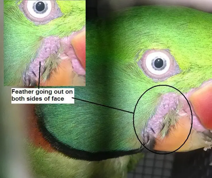 i am jk from Mumbai, India. I have a Alexandrina Parrot. Recently I found that feathers are coming out from both sides of his beak. I have enclosed a photo with close up. Can anybody help what is this and remedy? Regards jk