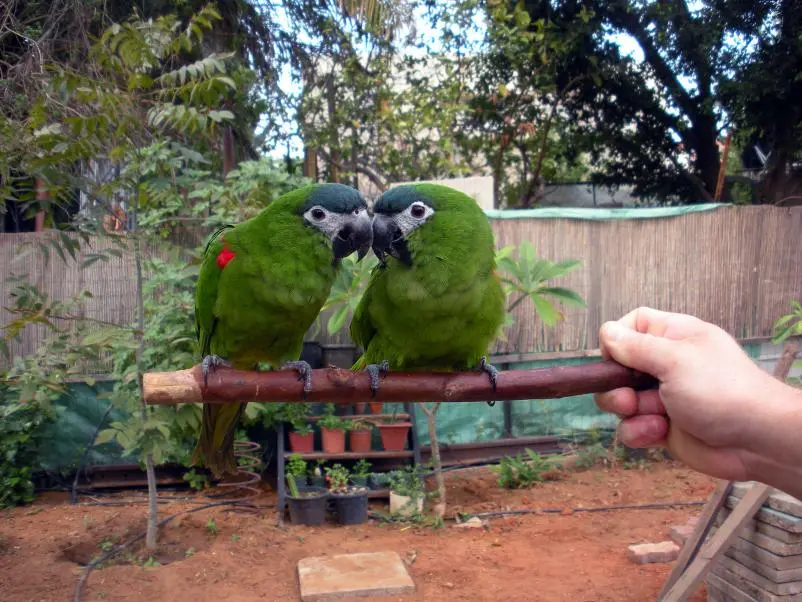hi, i have a pair of beautiful and energetic hahns macaws; male ruby and female amealia. ruby flew to me from a tree in my garden a few month ago, he had a ring on his leg and was very friendly, had obviously gotten lost and wanted somebody to take care of him. i built a cage 120cm x120cm x 60cm and i bought the female, amealia, from a guy who'd had her for half a year and said he bought her in a petshop. they bonded and are now inseparable