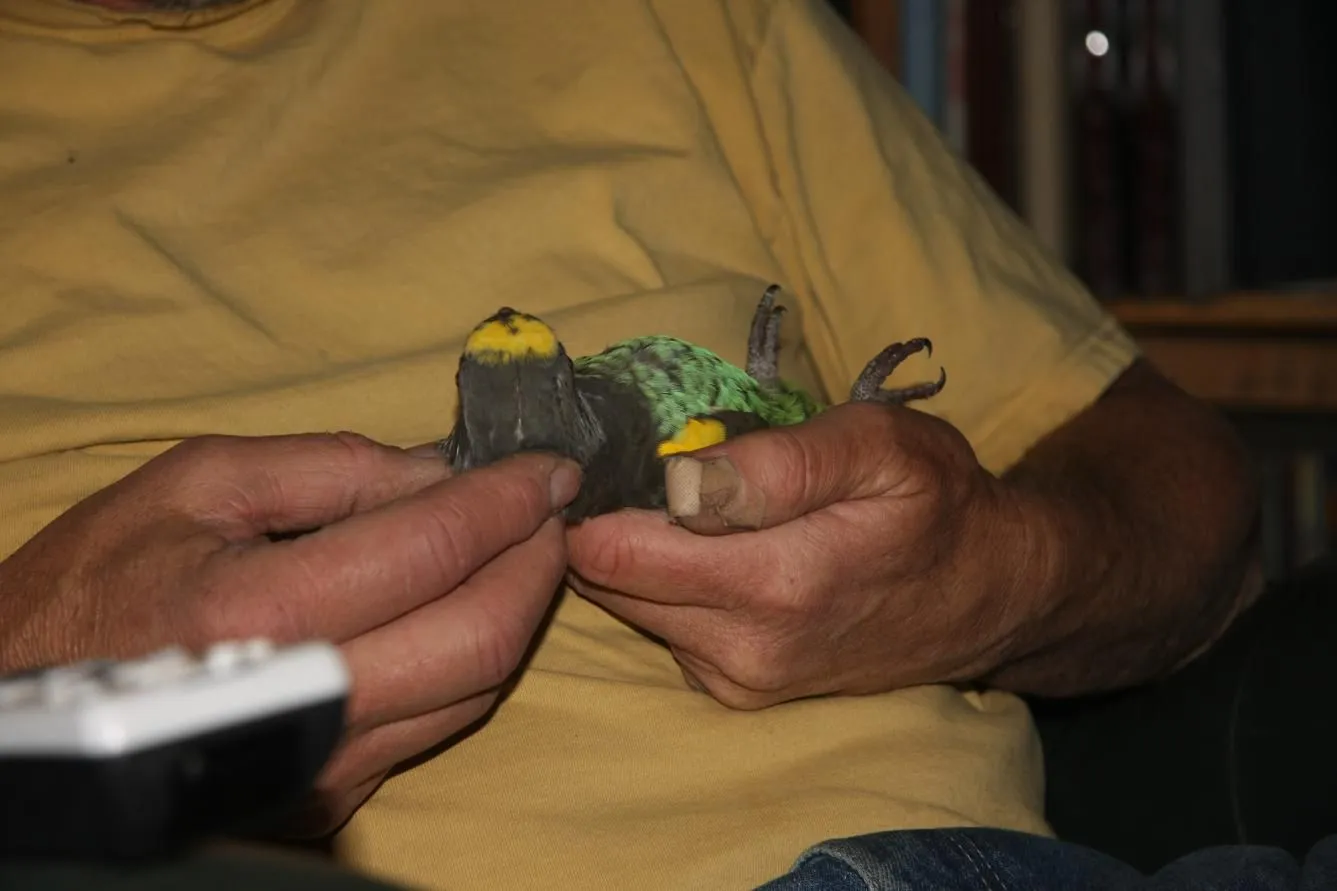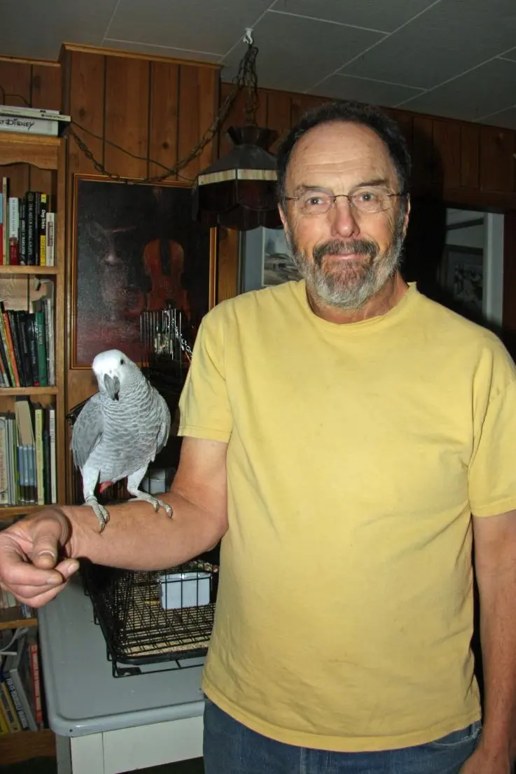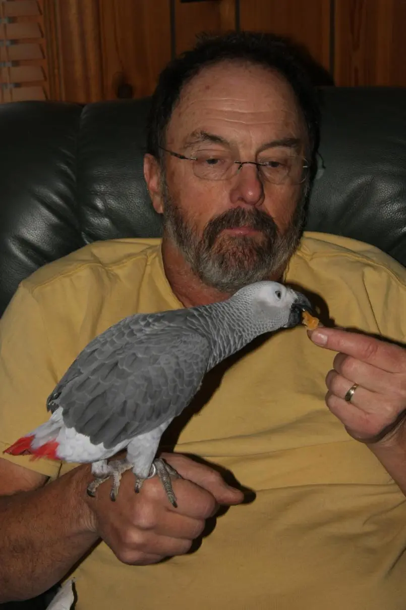 Hi, I am Lori, mostly a finch person,my hubby Peter is the Parrot guy. We have two parrots, Murphy, a Myers parrot who talks a blue streak, and most recently NZinga, a new African gray somewhere in the 6-8 month old range that I just surprised my Husband Peter with.