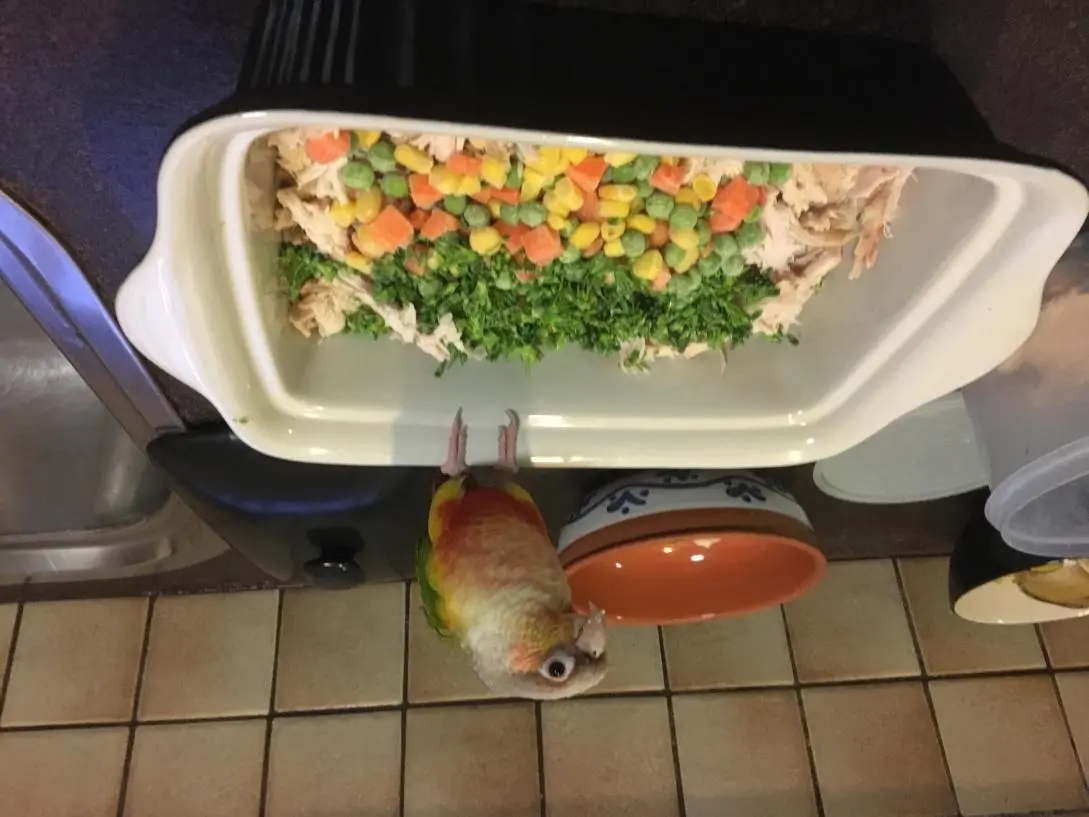 So my other half has expressed some concerns about my GCC's eating habits, specifically that she likes to run all over the kitchen bench when I'm cooking or preparing food. She likes to stand on the edge of bowls and help herself to whatever is there, particularly chicken (!), veggies and fruits, pasta, rice and bread (peanut butter in particular). He has suggested that I try to keep her eating from her own bowl, which of course I do, but this is easier said than done. She's out most of the day and loves to be around us. I think she's probably cleaner than my four and one year old sons, but wanted your opinions. She showers daily and isn't in contact with any other birds. So, is she germy?