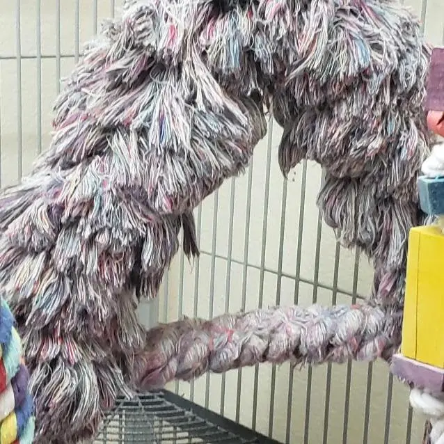 He is my problem. Axel has a perch (I will have a picture of it below) It is made out of yarn. He has had it since he was a baby. He is almost 6 now. He loves this perch. He has used it as his night perch since he was little, always uses it for that no other perch just this one. I have been reading about all the trouble about stringy things not good for them. I figured I would change it out but I am afraid it will stress him out