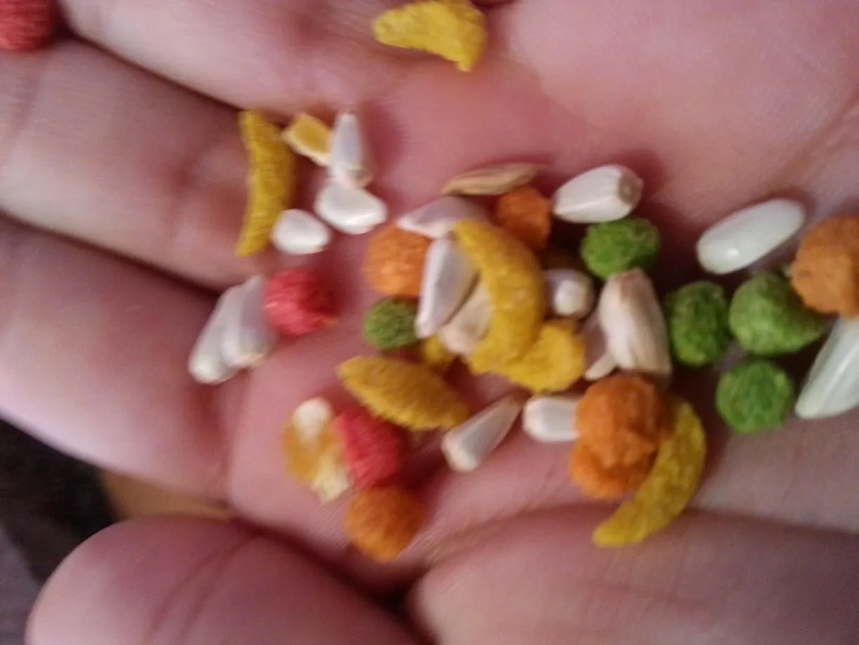 also the breeder gave me some pellets for her and its the zupreem fruit blend ones and he gave me some but with some tiny white seeds im not sure what they are but she never touches her zupreem fruit blend pellets and shes always eating the seeds and i heard too much is bad for them , i wanted to show u guys how it looks like