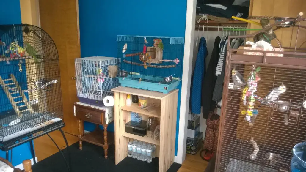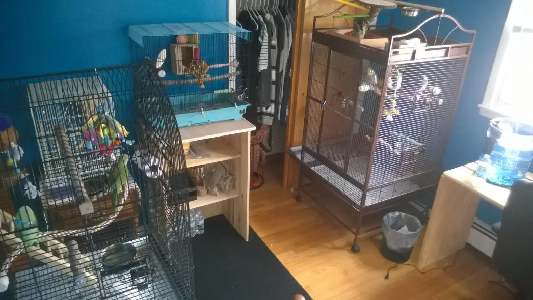Every single day, these birds get fresh water dishes & fresh food. The ones that I take out of the cage are the single birds, the quaker + lovebird. I do not take them out at the same time though
