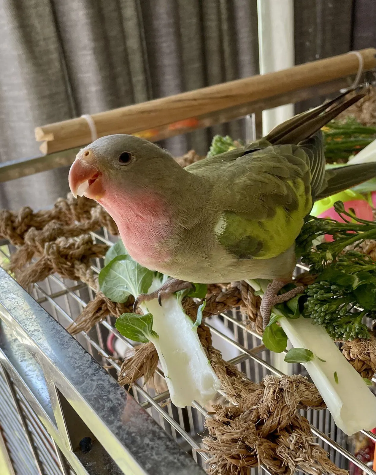precious bbgOh Uncle Boats, she has been SO much braver than me throughout this whole thing, and today I'd give her 10 out of 10 on the Peach-O-Meter!! I'd say there'll be a period of rebuilding of trust after all this, she must think that her life consists of my taking her off to somewhere where they'll hurt her every few days and it'll probably take a while for her to readjust. But today she's doing really well, squawking and demolishing her veg and playing with her toys and her handsome little boyfriend, and life is good.And I've NEVER seen a little birdy who loves her veg as much as she does!!