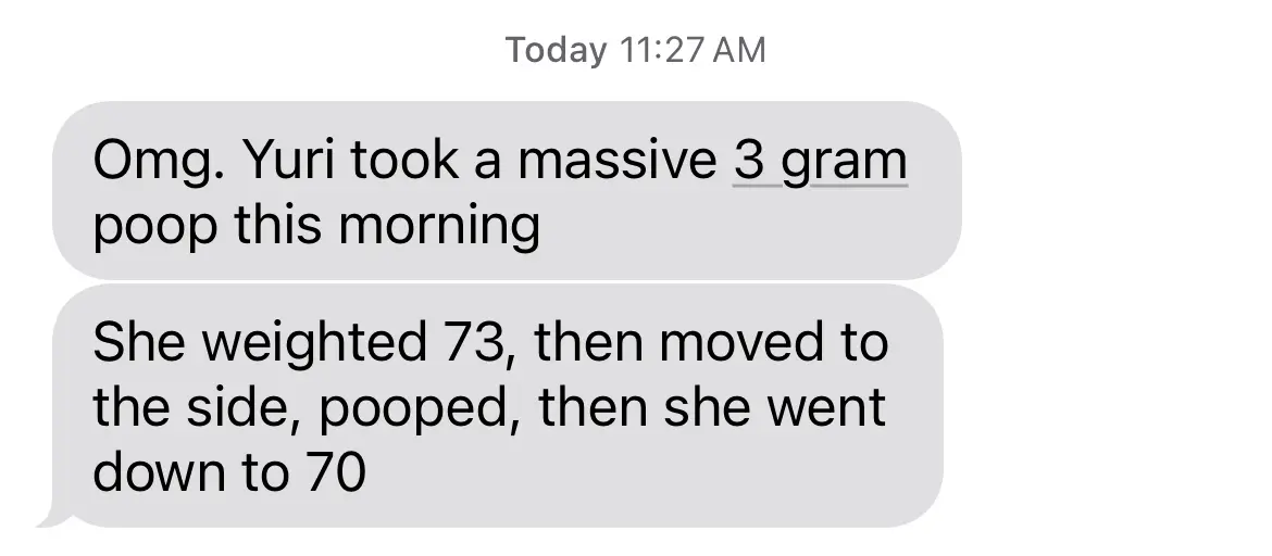 You know you've had parrots for a while when you text your spouse about the size of their poop. And that's a whopper alright!!We are learning that one of Yuri’s traits is she tends to take massive