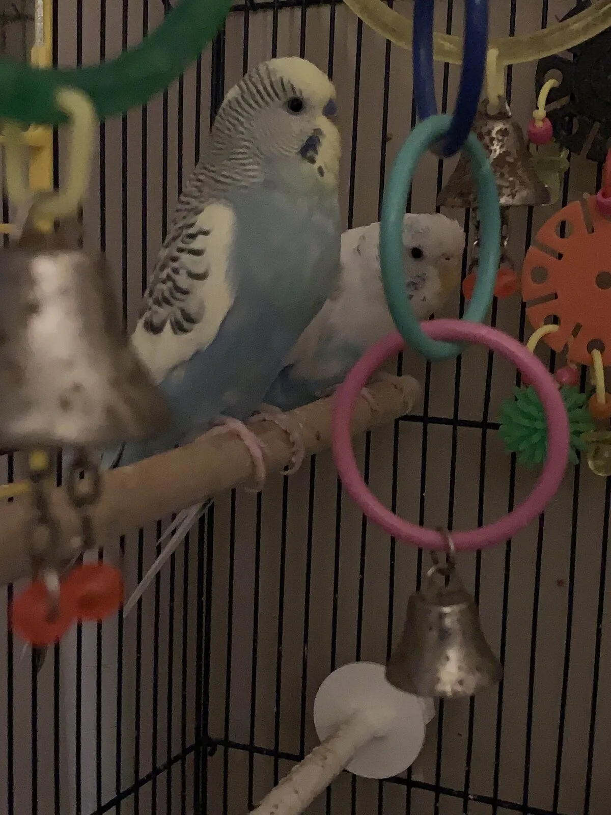 These are my budgies Sundew (blue + yellow male) and Winter (white + blue female)
