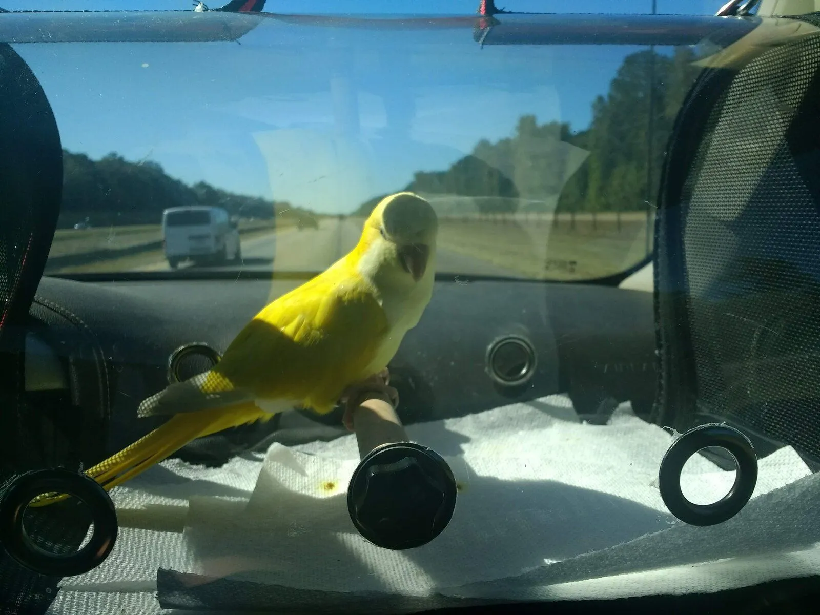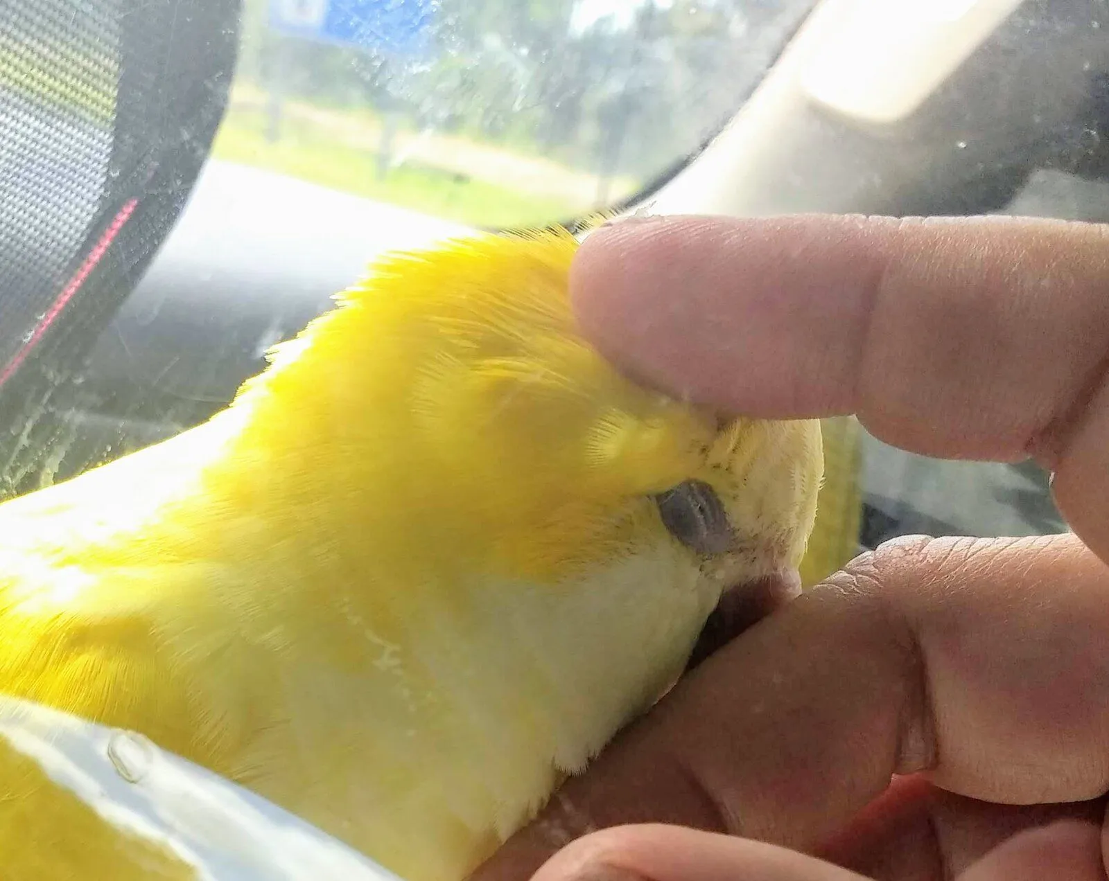 Pikachu in my travel carrier on the road home. And first head rub after an hour or so.