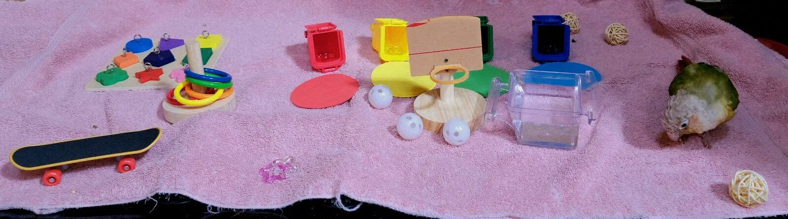 Where did you get all the lil toysI wonder if you can do what I had to do with the Sir: I left some of his favorite food and seeds on/near them until he felt safe enough to eat near/from them. But only like 1 or 2 of the toys at a time because he gets overwhelmed. He'll either just hide in the corner if there's too many out or try to fly off. As seen here lol He'd rather go without water and investigate the same piece of towel foe the rest of his life than approach that many. So, we started with just the skateboard and we're working on the bins now View attachment 32220