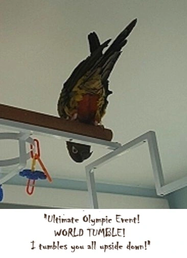 Competition is heating up now that the Rb is indahouse, Fang is inspired to show off his tumblin' skills too!The Rickeybird is the least agile parrot I know, so his accomplishments are mostly in his mind...