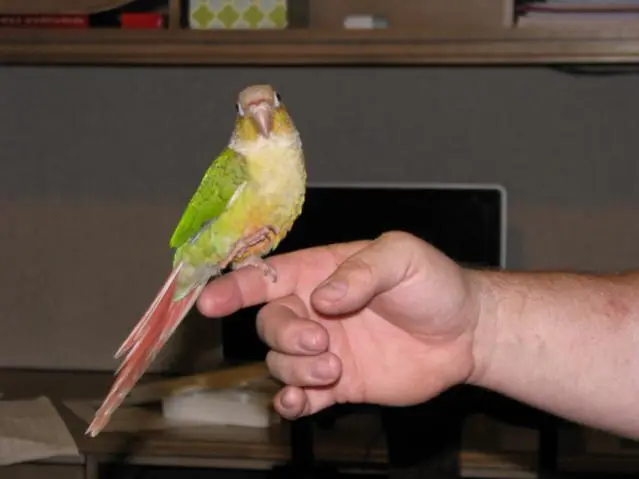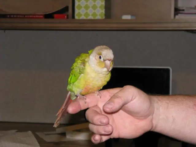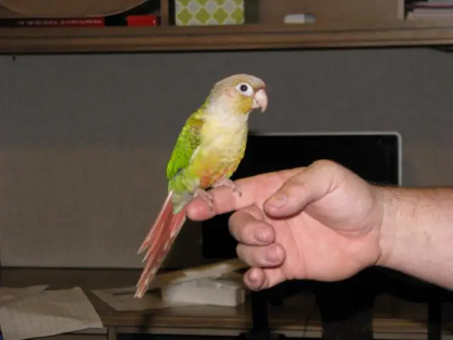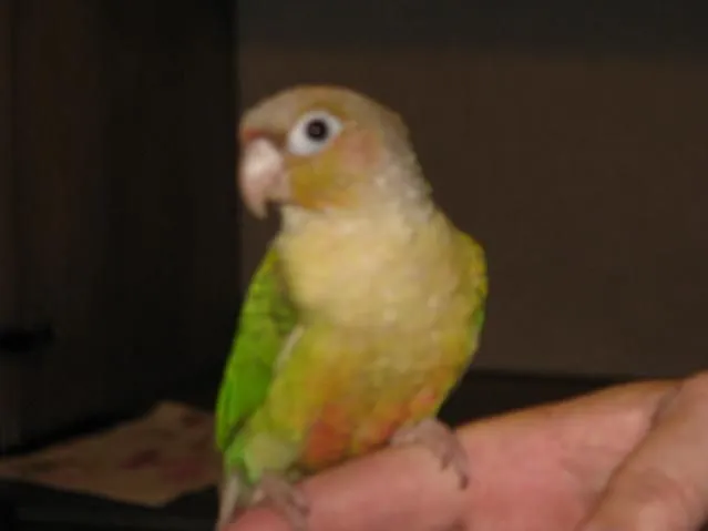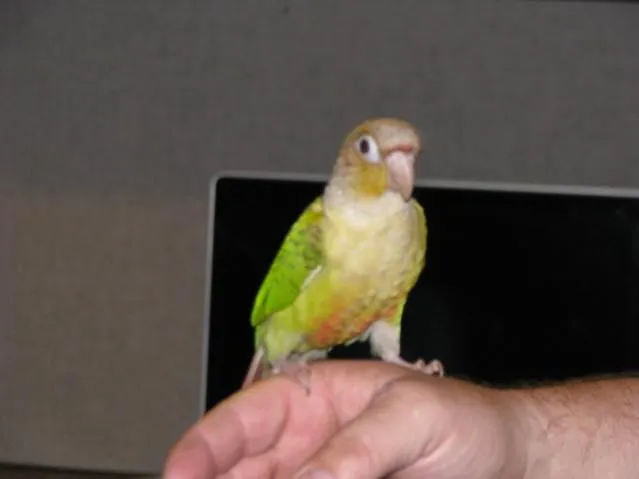 Skittles is 4 months old,and I was told she(she seems female to me)was a pineapple Conure,but to me she looks like a cinnamon ,but I am not sure nor do I really care LOL.
