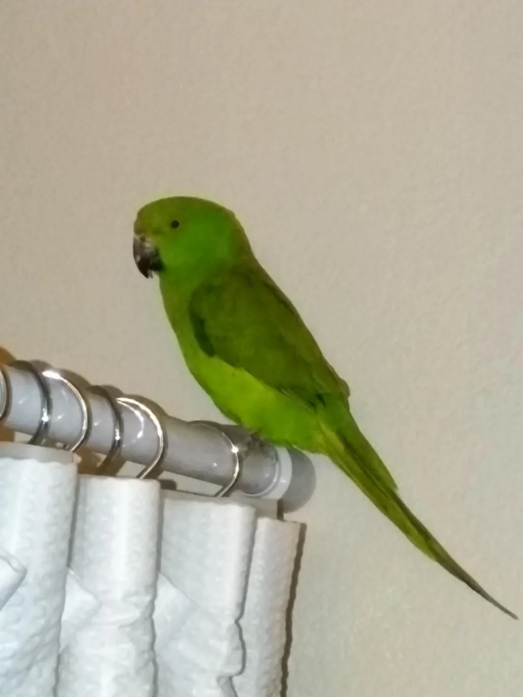 So in this pic she is on top of the shower curtain rod..her colors are really coming in nice. She has a nice two tone lime green color and I can see a little blue/blue-green/teal coming in...her tail feathers have gotten longer and her wings (which were cut by the previous owner) are definitely growing...I'll be letting her grown them out