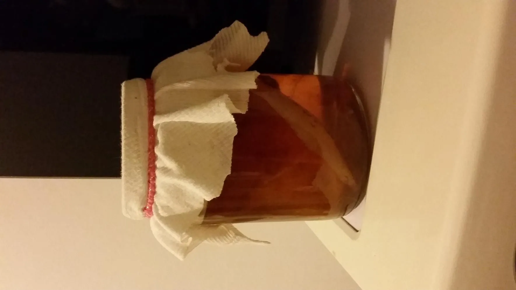 Here it is about a week into the process. The "chunk" was at the bottom of a bottle I bought at the store (all bottles have some chunks, but I spent a good 15 minutes comparing all the bottles at the store to find the biggest chunk to start with lol). The filmy stuff on top is the bacteria and yeast beginning to grow: