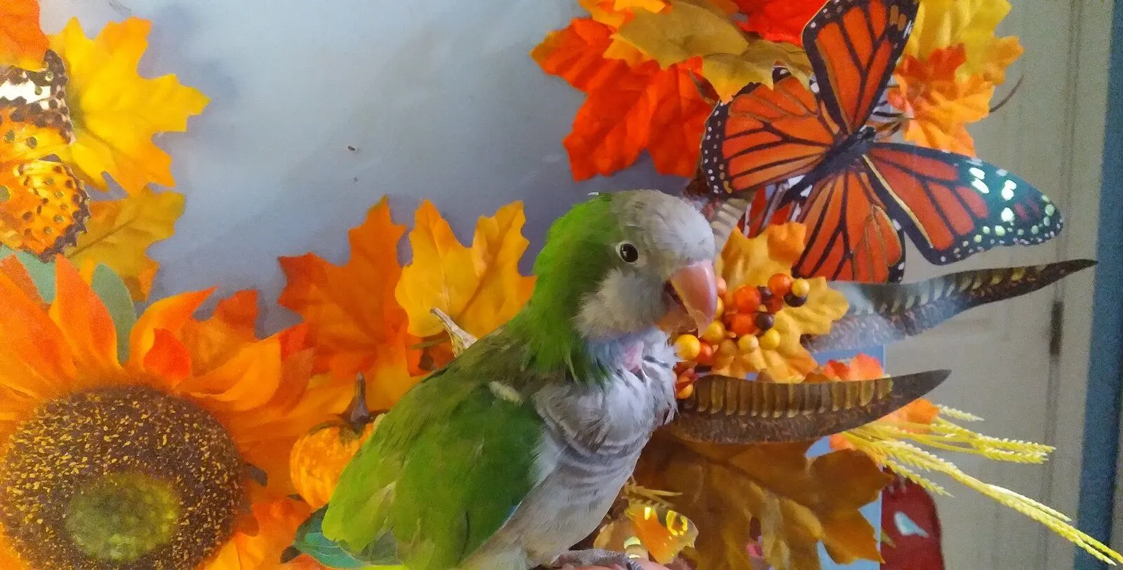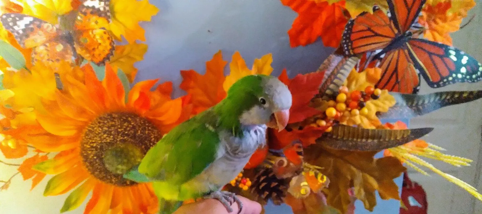I have an incredible trusting relationship with Phoebe. So while she was sitting on the back of my chair right at my ear screaming, I reached over and shut her beak, and held shut .