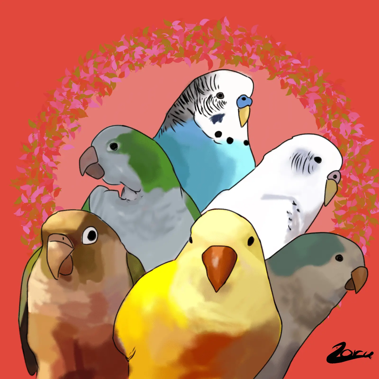 - Fang ({ab}normal grey cockatiel), Valentino (budgie), Jem (cinnamon cockatiel), Lovejoy(varied lorikeet), Peach (princess parrot)