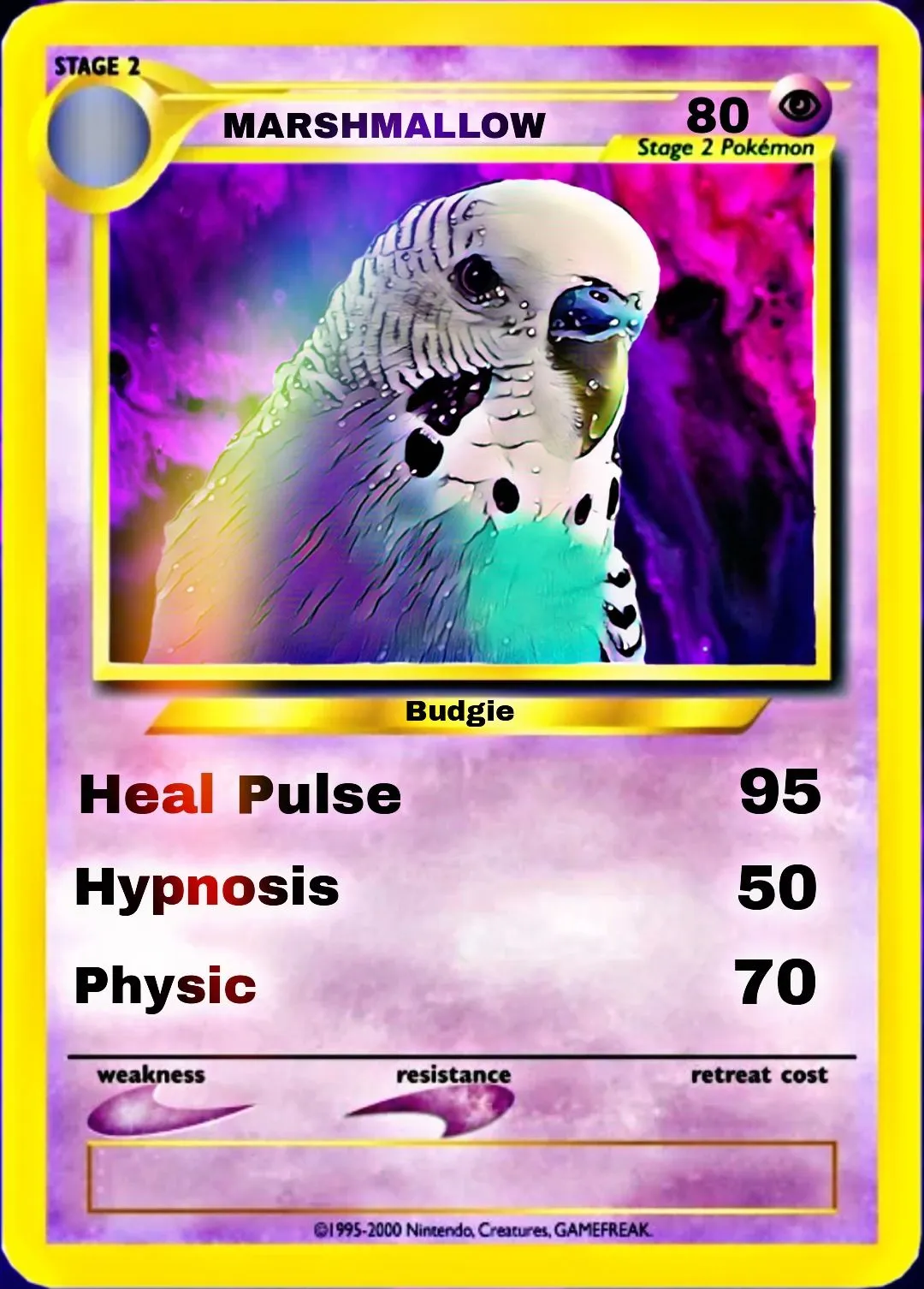 That's so cool, thank you so much!So I added some more features to my art studio, because I wanted to make your guys birds into even more realistic Pokemon. And after a long process of playing around I started with my next bird which was Marshmallow! He for sure will be a phsyic type budgie! If anyone wants to do a re edit just let me know! I'll happily do it.View attachment 55511
