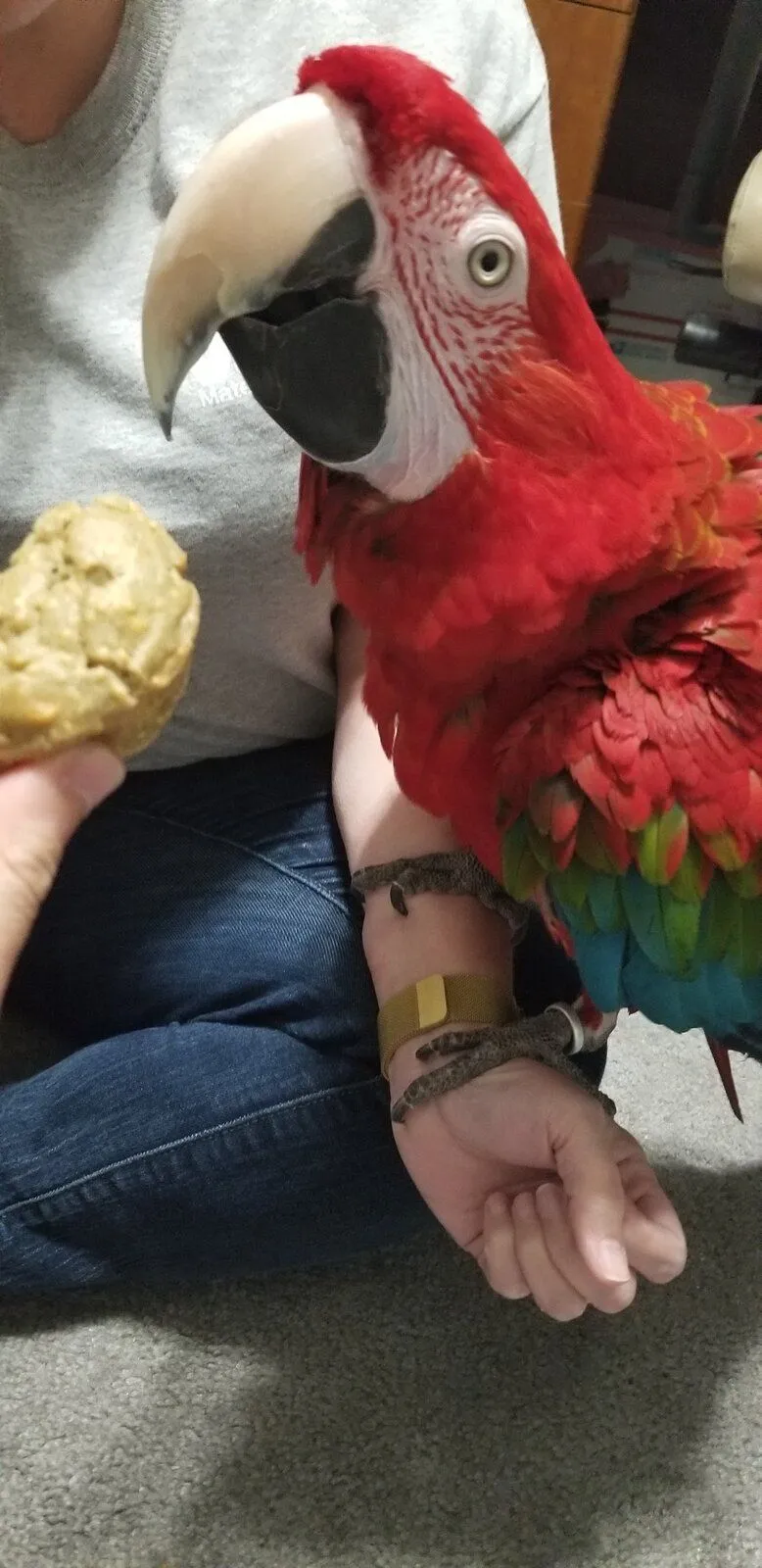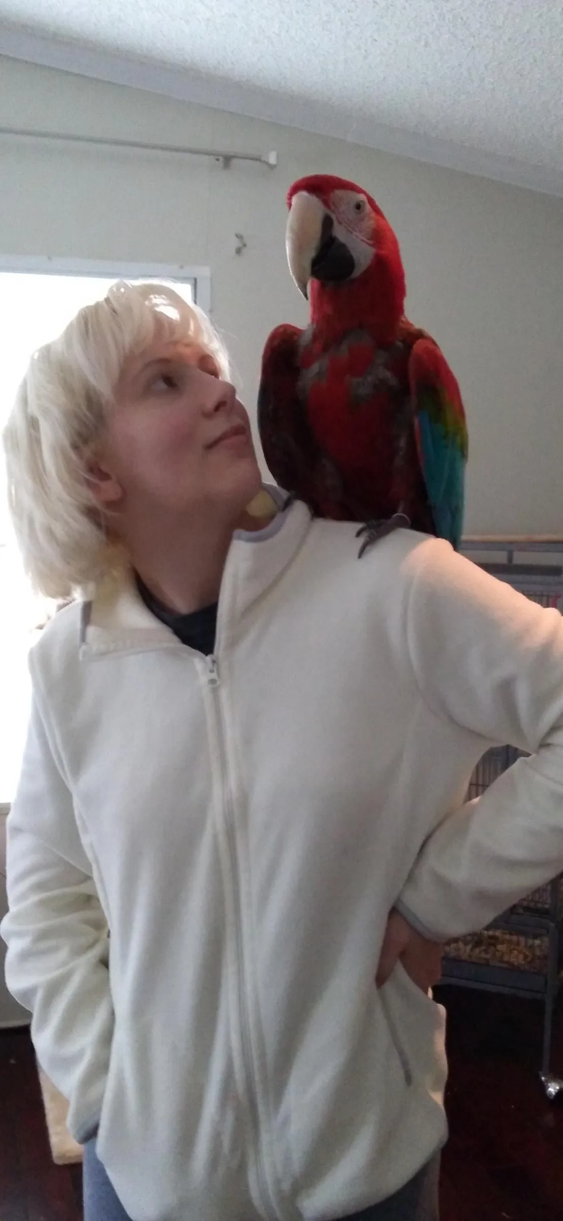 My mom is able to get him to stretch out his wings on command. He looks like an angel when he's got them fully spread out, and he likes to show his big wings off by gently flapping them.