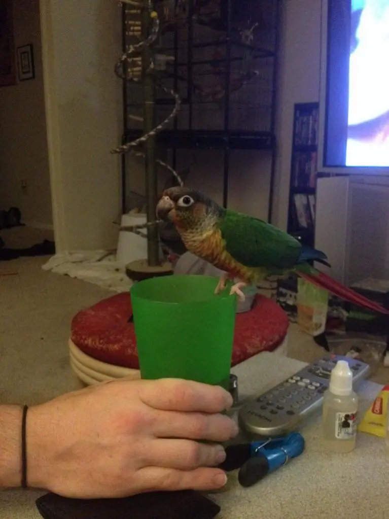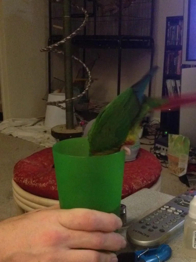 So Loki isn't very hands-on, as he prefers the company of Kiwi. But he decided to climb down the stand and waddle over to Brad for some attention(and apple juice!)