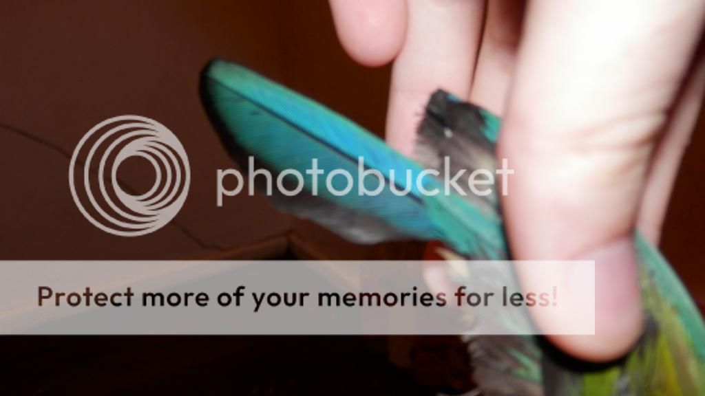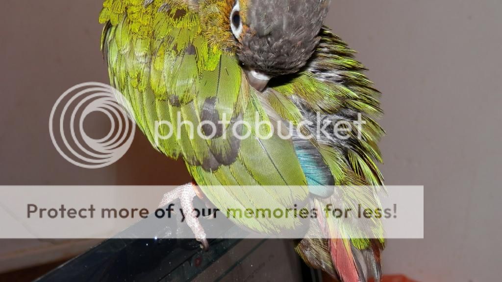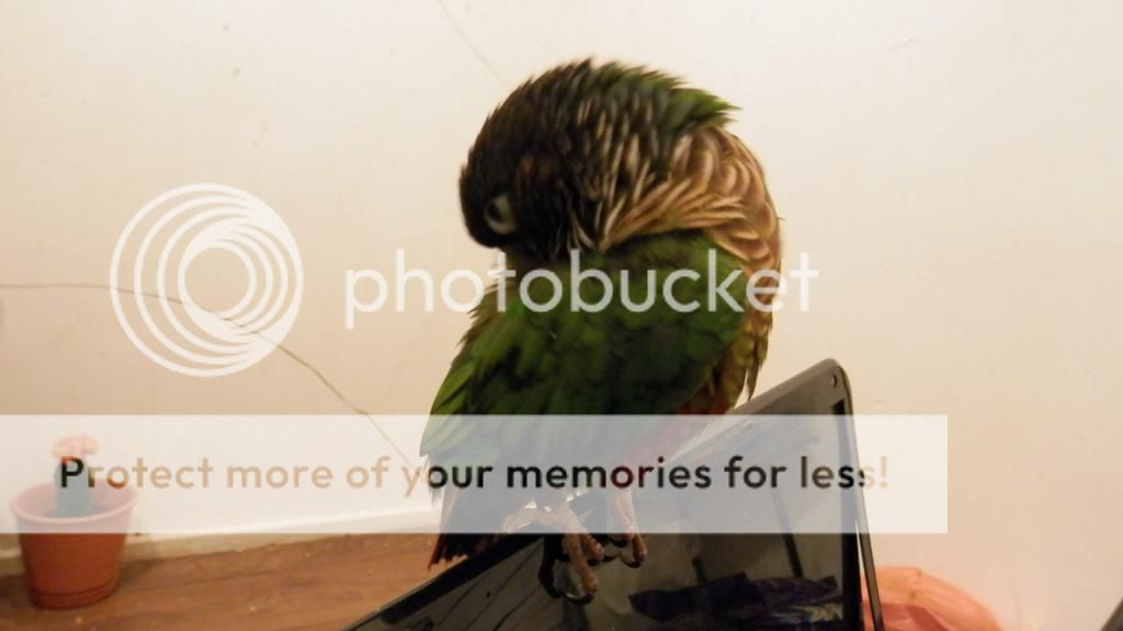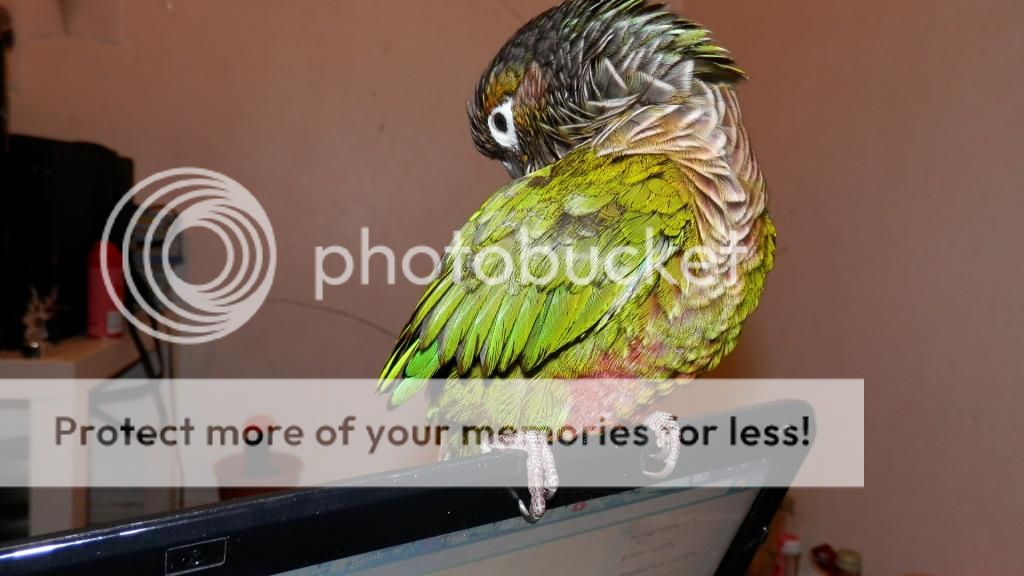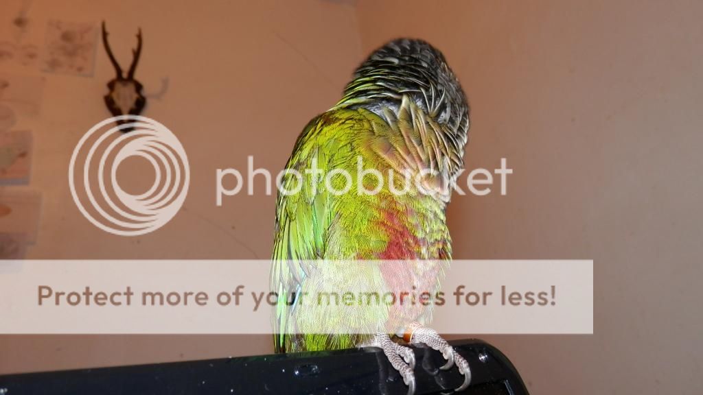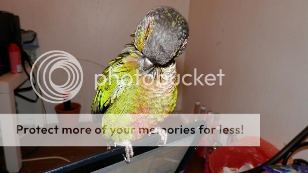Cookie tries to preen Merle when I have them out together, but Merle opens his beak at Cookie, so I don't risk it. I think he can be a bit jealous if Cookie is on my shoulder and he isn't too. They did share some pellets though.